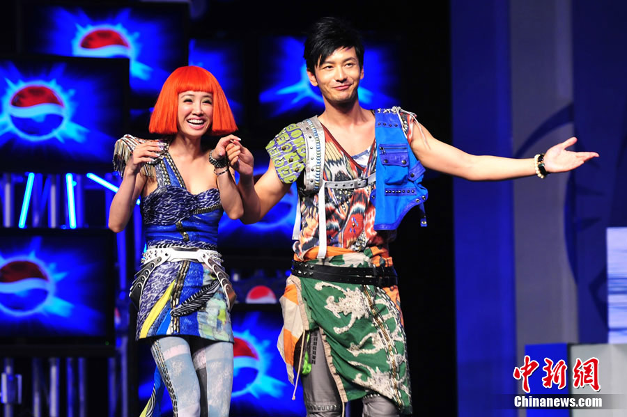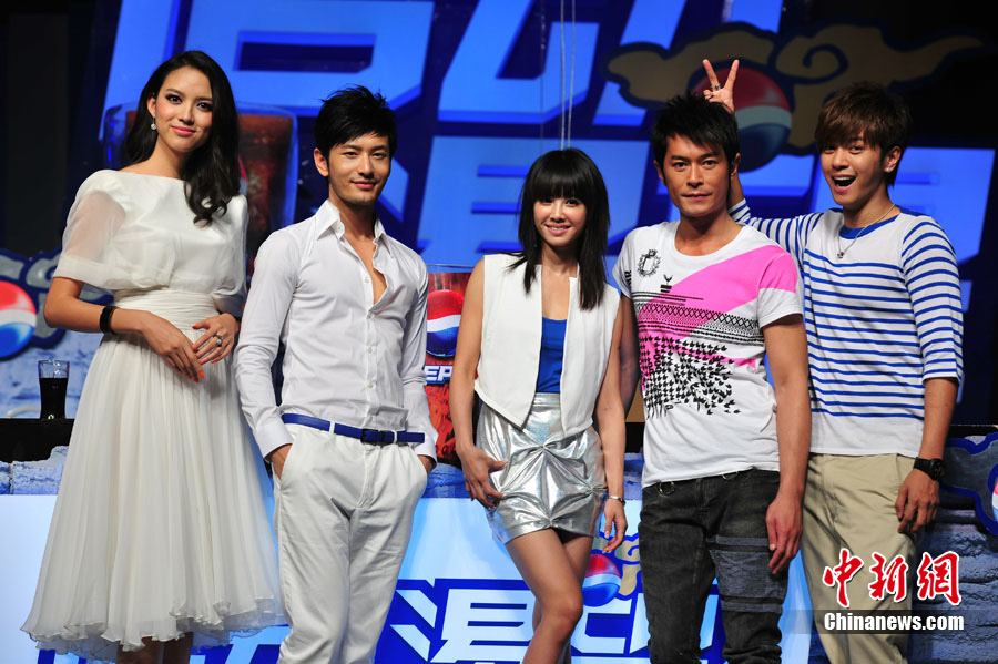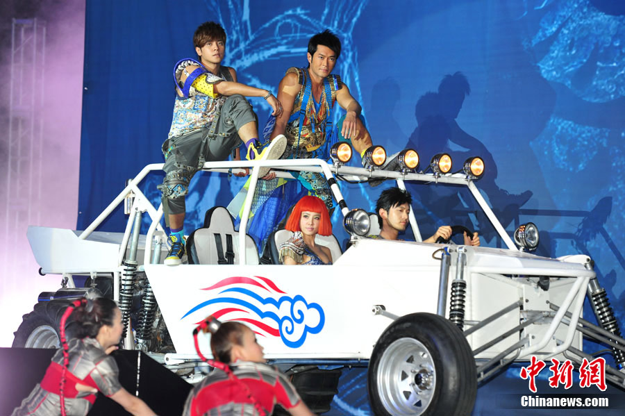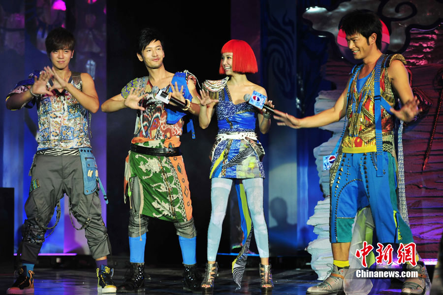 7月21日,國際某飲料巨頭在北京召開新聞發(fā)布會,最新主題廣告震撼首播。古天樂、羅志祥、黃曉明、蔡依林身著華麗戰(zhàn)袍駕駛戰(zhàn)車亮相,他們以師兄弟的身份打造全新“西游記”,“世界小姐選美大賽冠軍”張梓琳更是以蜘蛛精身份出演。中新社記者 富田 李學(xué)仕 攝