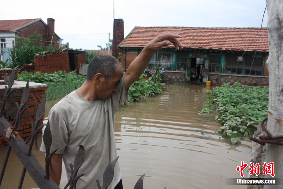 7月21日4時(shí)30分左右,遼寧省鐵嶺縣境內(nèi)勝利河阿吉段決口,決口寬度20米,流量600立方米/秒,淹沒(méi)耕地5000畝,當(dāng)?shù)伛v軍、公安干警、民兵預(yù)備役400多人投入抗洪搶險(xiǎn),轉(zhuǎn)移群眾3000多人。此前該地區(qū)連降暴雨,平均降雨362毫米。圖為阿吉村民金福祥看著自己家被淹沒(méi)非常傷心。中新社發(fā) 秦逸 攝