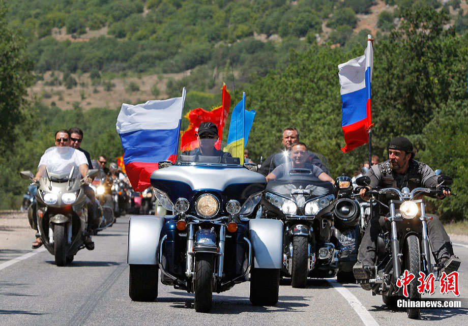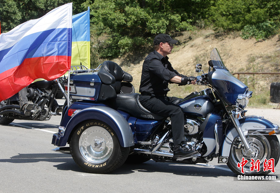 當?shù)貢r間7月24日,在烏克蘭塞瓦斯托波爾,俄羅斯總理普京駕駛一輛哈雷摩托車前往一個俄羅斯和烏克蘭摩托車愛好者的聚會營地參加活動。