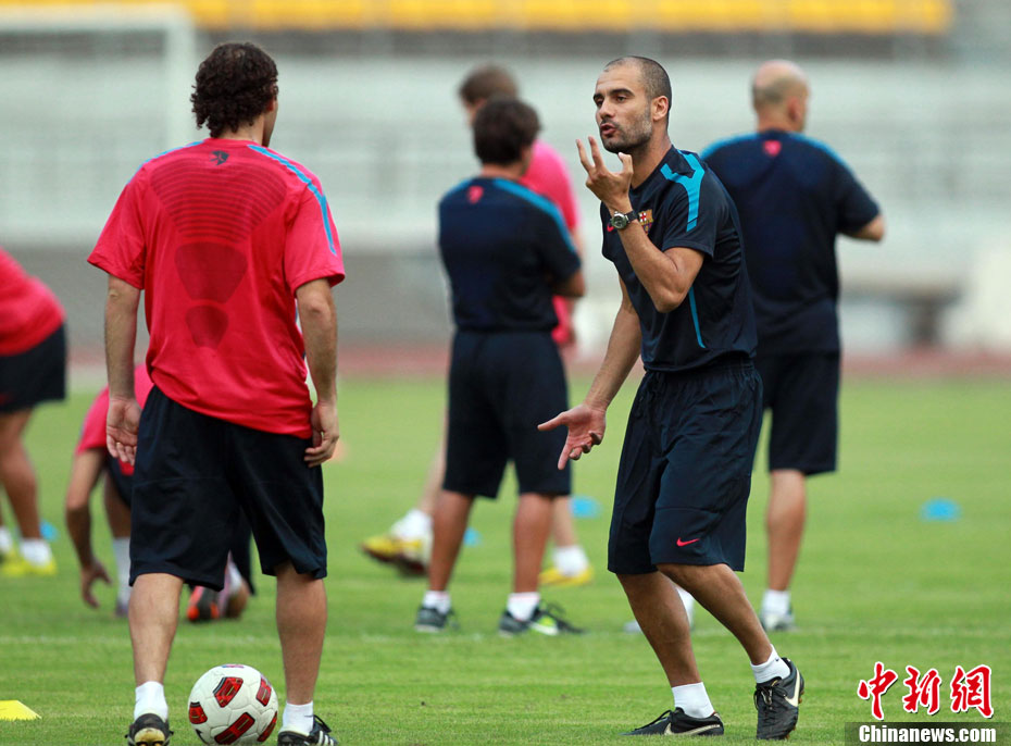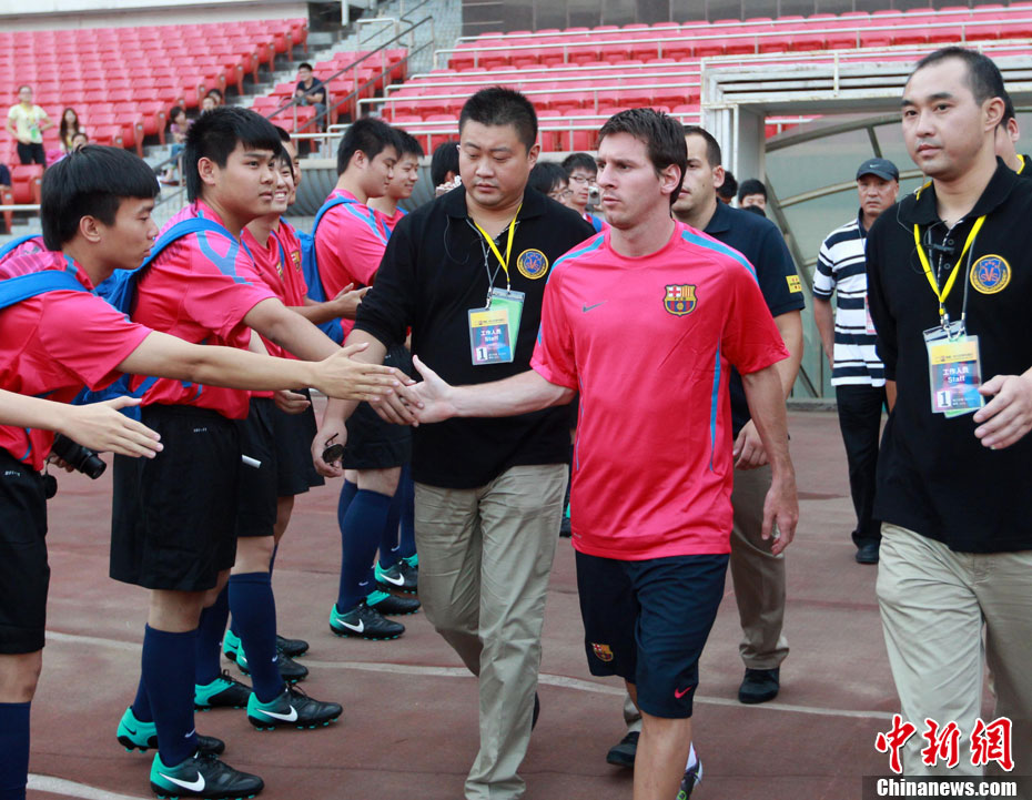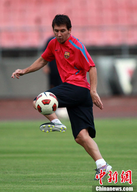 8月6日,巴塞羅那俱樂部在北京工人體育館進(jìn)行了第二次公開訓(xùn)練課,眾多巴薩球迷也在現(xiàn)場目睹了球隊(duì)風(fēng)采。圖為梅西出場表情輕松。中新社發(fā) 杜洋 攝