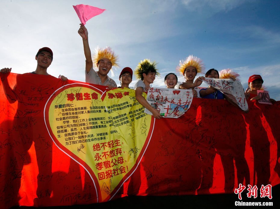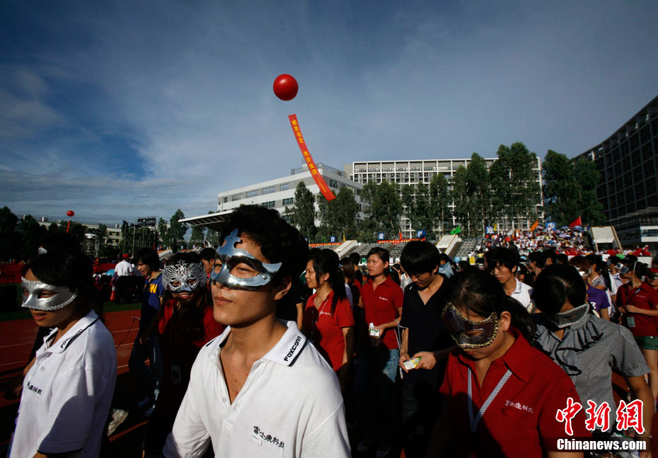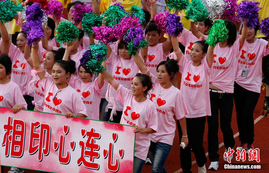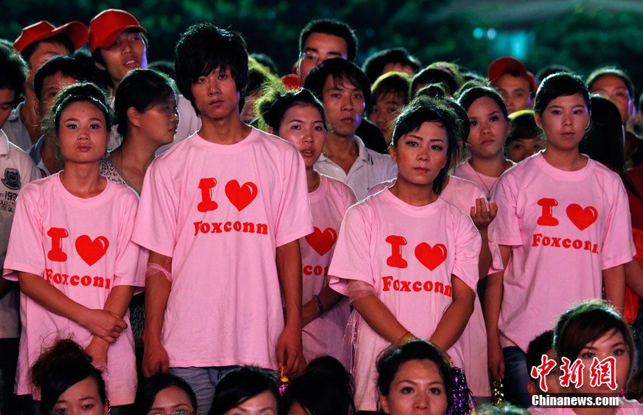 8月18日下午,深圳市富士康廠區(qū),舉行了一場(chǎng)由富士康員工自發(fā)倡議、富士康工會(huì)聯(lián)合會(huì)組織的規(guī)?涨暗娜f(wàn)人誓師活動(dòng),活動(dòng)的主題是“珍惜生命,關(guān)愛(ài)家人”,2萬(wàn)員工跟著一輛輛彩車(chē)歡聲笑語(yǔ),員工們說(shuō)這是他們的“狂歡節(jié)”。