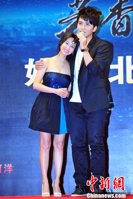 8月25日,電影《芳香之城傳奇》在北京舉行記者會(huì)。不老的“紫霞仙子”朱茵攜主演扎西頓珠、張達(dá)明、李子雄、張璇、董立范等亮相。朱茵以一襲抹胸短裙亮相,自曝在新片中大轉(zhuǎn)型,飾演一個(gè)有天然體香的神秘啞女,男主角扎西頓珠飾演的“富二代”被其吸引后,上演了一段純美姐弟戀。朱茵在接受采訪時(shí)坦言自己并不拒絕姐弟戀。圖為朱茵、扎西頓珠現(xiàn)場(chǎng)秀親昵。中新社記者 李學(xué)仕 攝