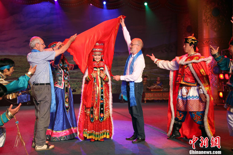 8月25日晚,參加“鄂爾多斯青銅器與早期東西方文化交流——北方草原通道”國際學(xué)術(shù)研討會的近百位中外考古學(xué)家,觀賞蒙古族傳統(tǒng)婚禮。圖為英國劍橋大學(xué)馬丁·瓊斯教授(右)、倫敦大學(xué)大衛(wèi)·哈里斯教授擔(dān)任婚禮主婚人,并應(yīng)邀掀開新娘子的紅蓋頭。中新社記者 孫自法 攝