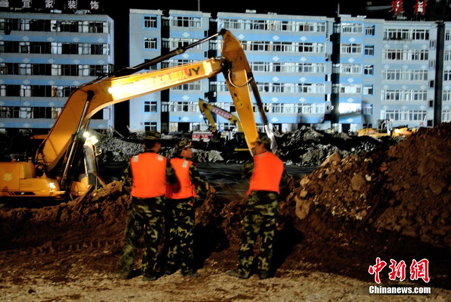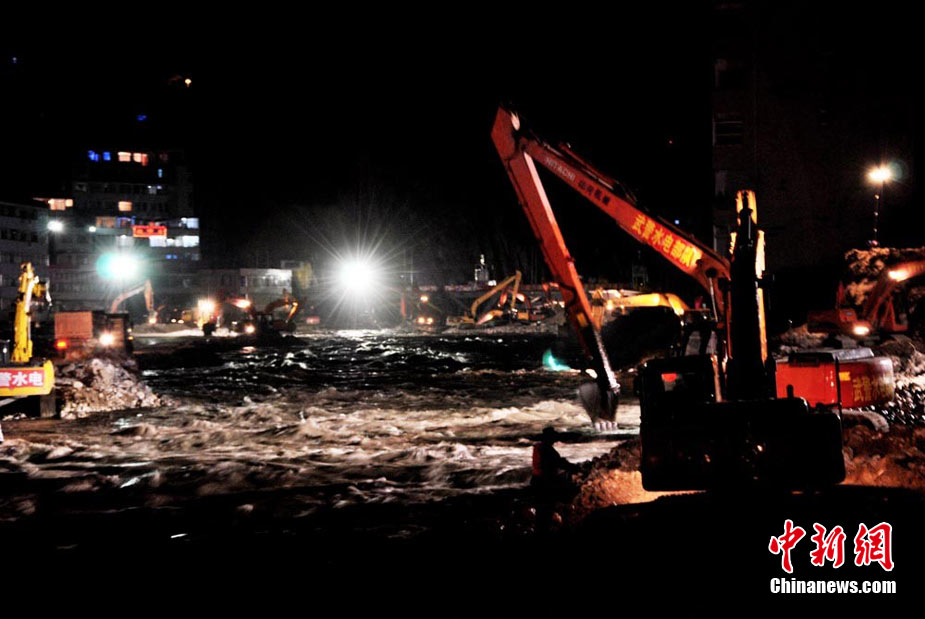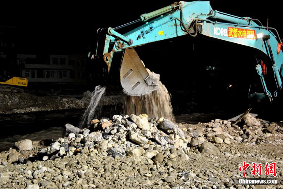 為盡快消除舟曲特大泥石流形成的白龍江堰塞體,疏通河道,早日解除舟曲縣城水患,武警水電部隊官兵日夜艱苦奮戰(zhàn)在在1.5公里的白龍江兩岸搶險一線, 24小時晝夜挖掘和清理河道中的碎石淤泥,到目前水位下降已3米多 縣城淹沒房屋逐退水面。白龍江堰塞體搶險工作已全面進入沖刺階段,圖為8月26日晚11時左右武警水電部隊官兵夜戰(zhàn)白龍江的施工現(xiàn)場。中新社記者 侯志紅 攝