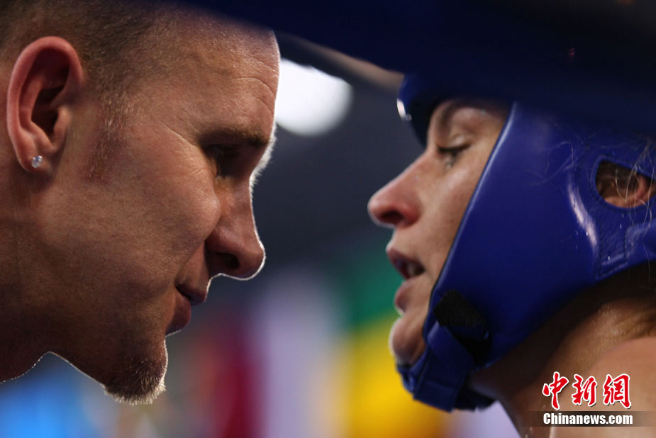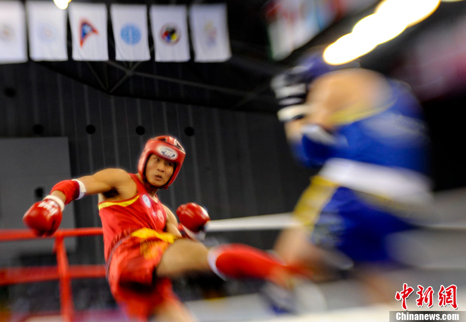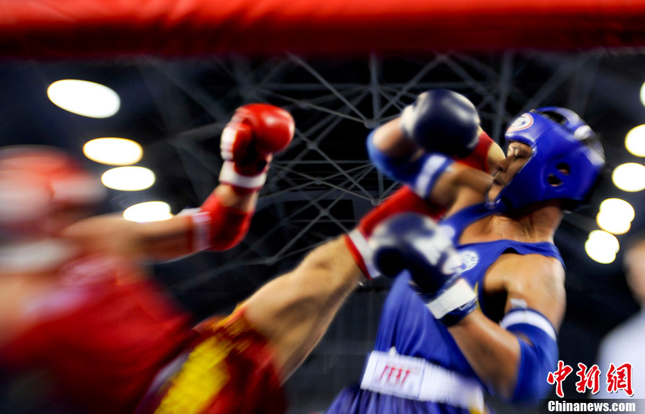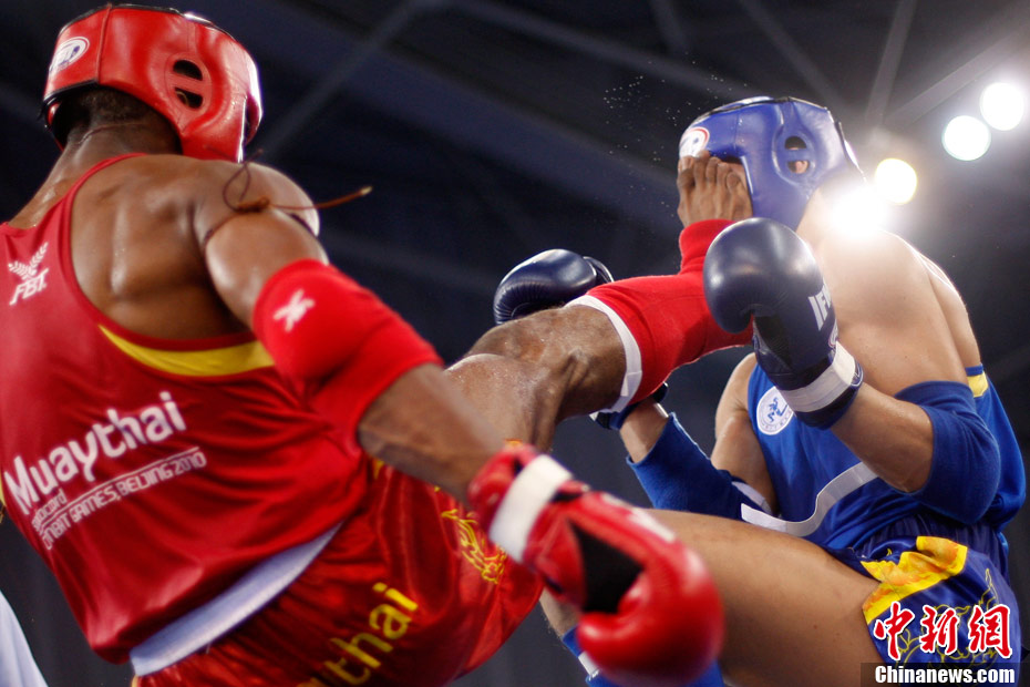 8月31日,2010年北京首屆世界武搏運(yùn)動(dòng)會(huì)泰拳比賽在北京奧體中心體育館進(jìn)行了11個(gè)級(jí)別半決賽的較量,包括8個(gè)級(jí)別的男子半決賽和3個(gè)級(jí)別的女子半決賽。 中新社發(fā) 盛佳鵬 攝