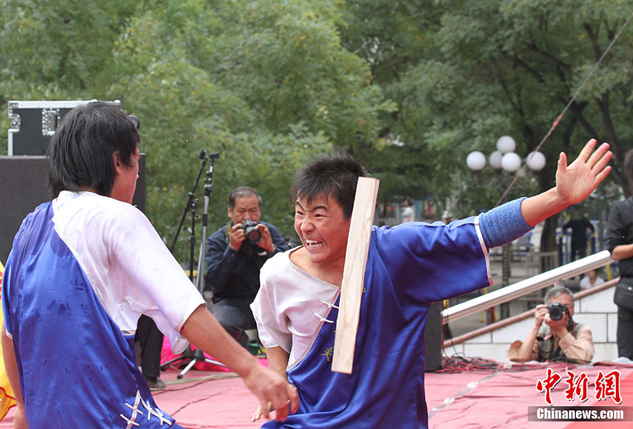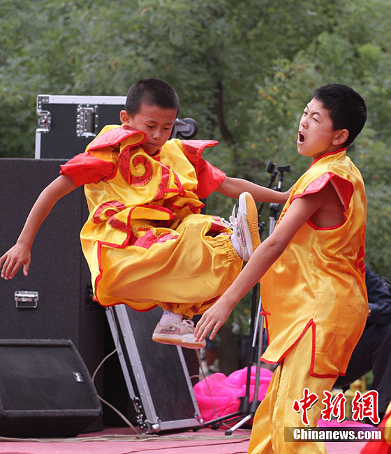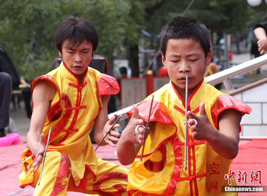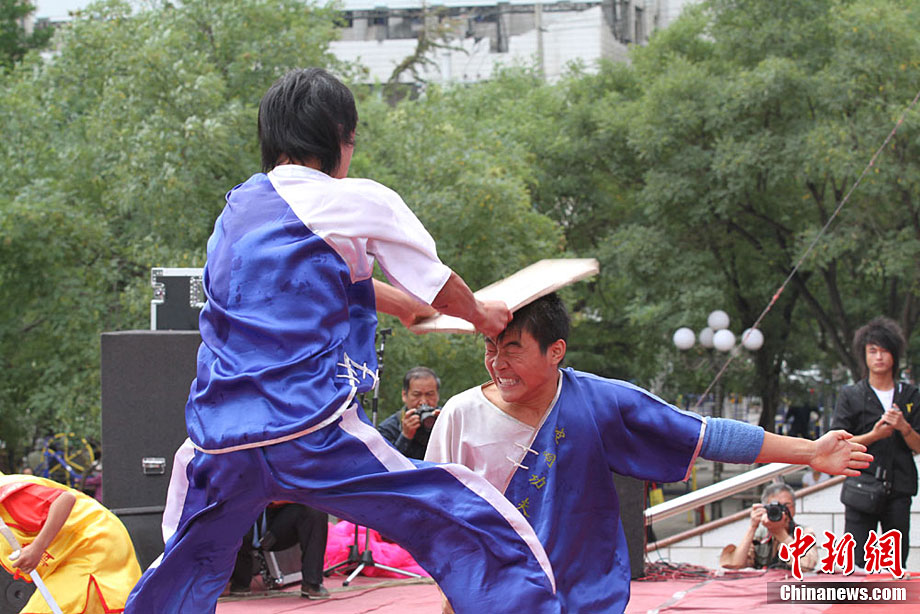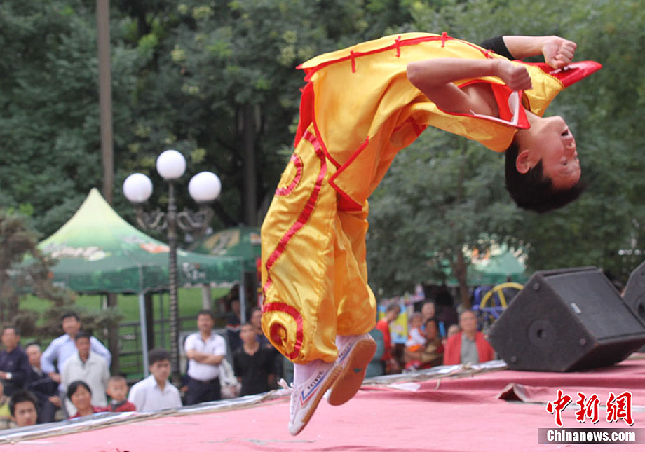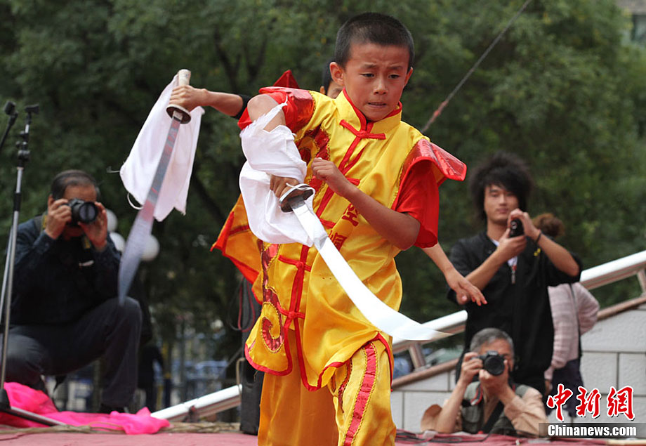 9月1日,蘭州東方紅廣場上演一場崆峒武術(shù)秀。崆峒派武術(shù)是與少林、武當、峨嵋、昆侖齊名的五大武術(shù)流源之一,崆峒武術(shù)與道教文化緊密相連,神秘奇詭,風格獨特。中新社記者 殷春永 攝