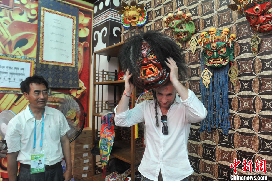 9月3日,上海世博會(huì)西藏活動(dòng)周進(jìn)入第3天。土耳其姑娘Esmeralda Sinani來到上海世博會(huì)寶鋼大舞臺(tái),體驗(yàn)藏族文化。圖為Esmeralda Sinani在喝酥油茶,并向藏族人吉吉了解酥油茶相關(guān)的文化。 中新社記者 蔣雪林 攝
