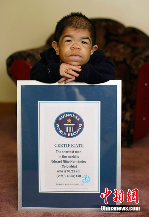 身高僅70厘米的哥倫比亞男子愛德華·尼科·埃爾南迪斯近期獲得吉尼斯世界紀(jì)錄世界最矮男人的稱號(hào)。身高為74厘米的前吉尼斯世界紀(jì)錄保持者何平平3月13日去世后,吉尼斯紀(jì)錄認(rèn)證官員找到了身高70厘米的埃爾南迪斯。現(xiàn)年24歲的他體重只有10公斤,出生時(shí)體重為1.5公斤,體長38厘米。然而,埃爾南迪斯的這個(gè)頭銜不會(huì)保持太久,尼泊爾少年馬加爾今年10月14日年滿18周歲后,有望取代他成為世界最矮的男人,馬加爾身高僅56厘米。