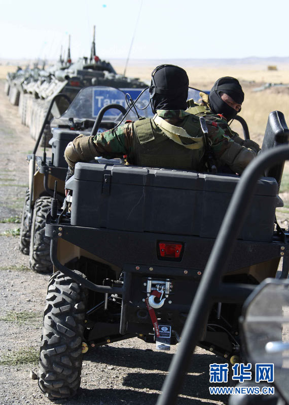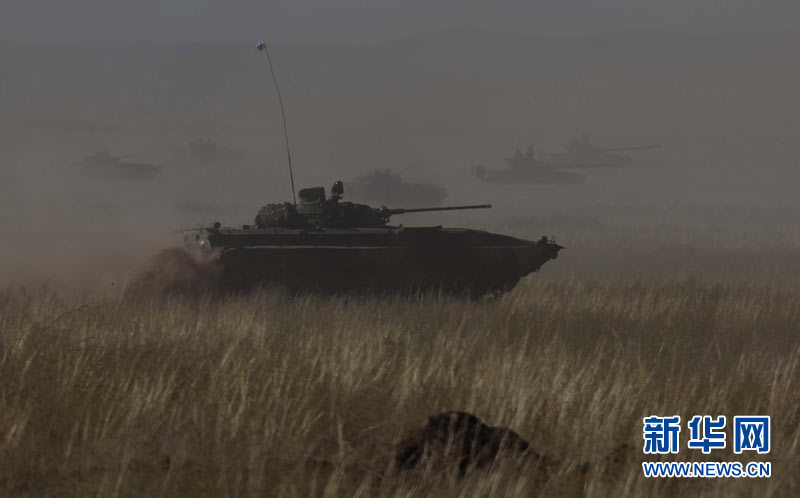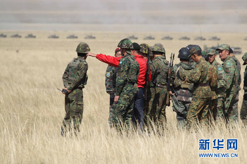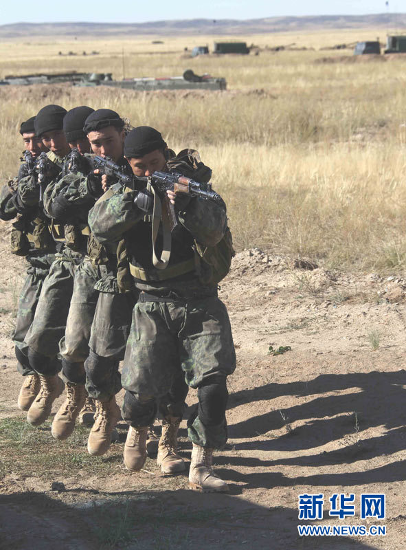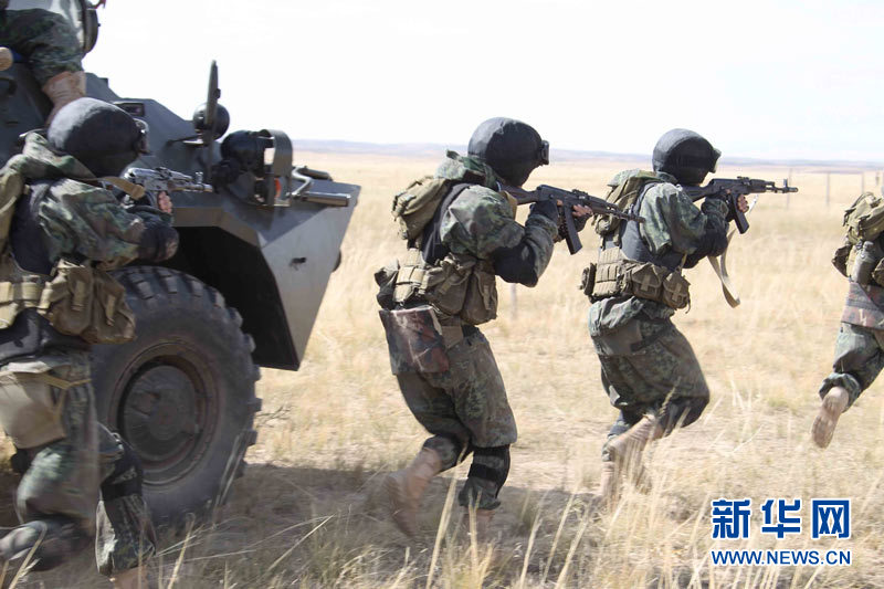 9月15日,參加上海合作組織成員國(guó)武裝力量聯(lián)合反恐軍事演習(xí)的哈薩克斯坦、中國(guó)、吉爾吉斯斯坦、俄羅斯、塔吉克斯坦五國(guó)參演部隊(duì)成功舉行第二次實(shí)兵合練。王建民 攝 圖片來源:新華網(wǎng)