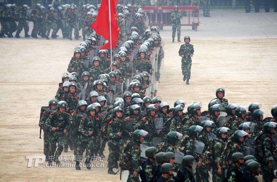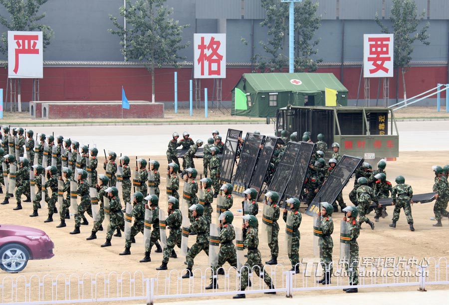 訓練場內(nèi),面對各種突發(fā)情況,官兵手持盾牌、警棍,排成各種陣型,疾進如風,徐推如林……