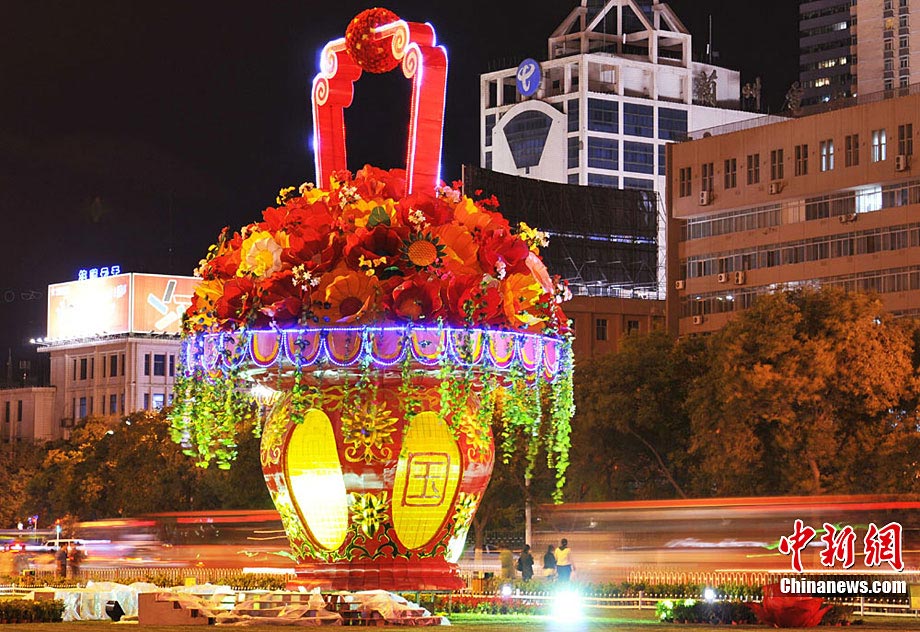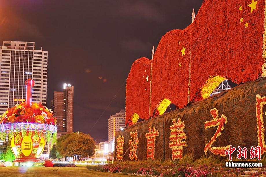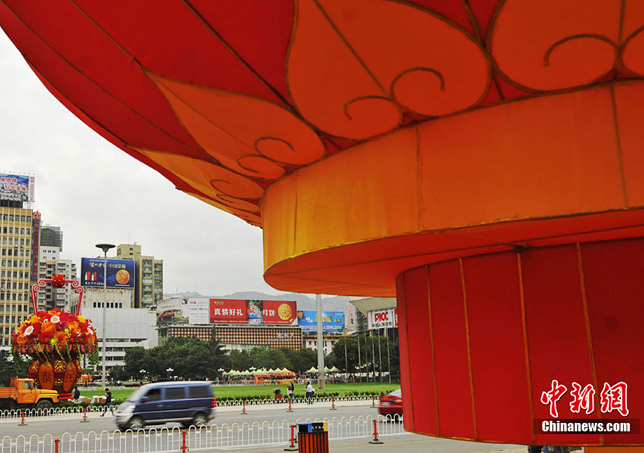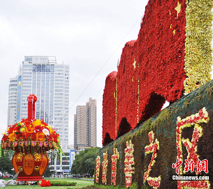 9月20日,中秋、國(guó)慶雙節(jié)即將到來(lái),蘭州東方紅廣場(chǎng)布置一新,花籃上標(biāo)注有“和諧社會(huì)”與“國(guó)泰民安”。 楊艷敏 攝