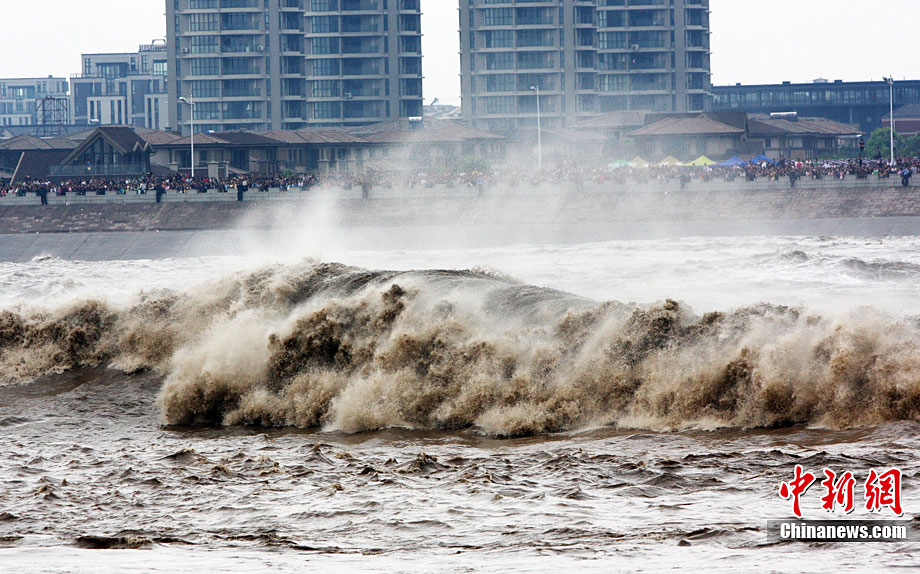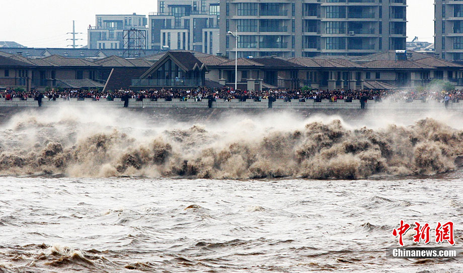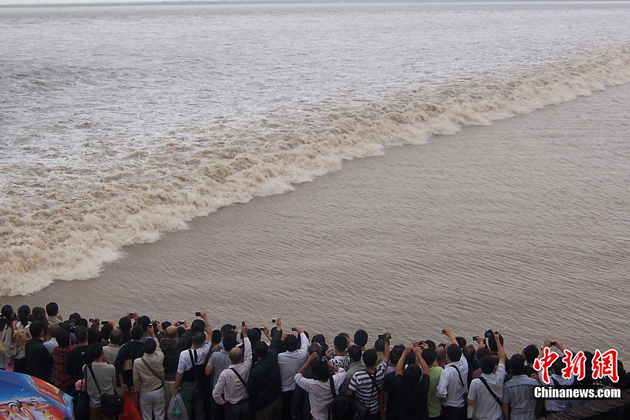 八月十八潮,壯觀天下無。9月25日12時38分,近八年最大錢塘潮如約而至抵達浙江省海寧鹽官,來自世界各地的游客爭睹“一線潮”景觀。汪恩民 攝