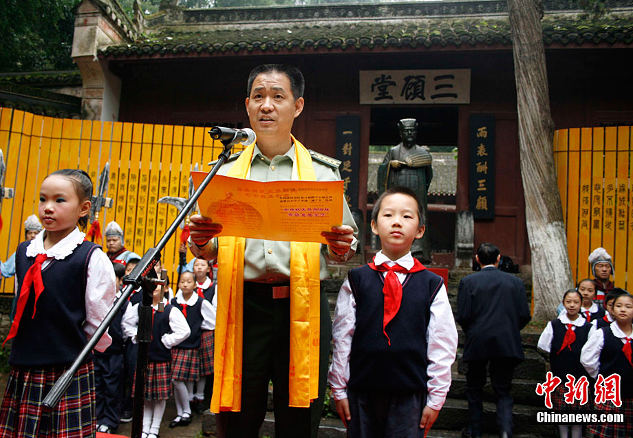 “夫君子之行,靜以修身,儉以養(yǎng)德……”9月25日上午,湖北襄樊市城區(qū)及各縣市區(qū)的各大中小學(xué)校百萬名學(xué)子,以校為單位,齊誦諸葛亮《誡子書》。此舉創(chuàng)下了新的吉尼斯世界紀(jì)錄,并獲吉尼斯總部代表現(xiàn)場頒發(fā)證書!墩]子書》是諸葛亮54歲臨終前寫給8歲兒子諸葛瞻的一封家書,成為后世歷代學(xué)子修身立志的名篇。其核心內(nèi)容是教育人們要“寧靜致遠(yuǎn),淡泊明志”。在活動現(xiàn)場,襄樊籍航天員聶海勝表示非常崇拜諸葛亮,一部《誡子書》影響了一代又一代人。他還寄語青少年:修身養(yǎng)性,服務(wù)人民!張暢 攝