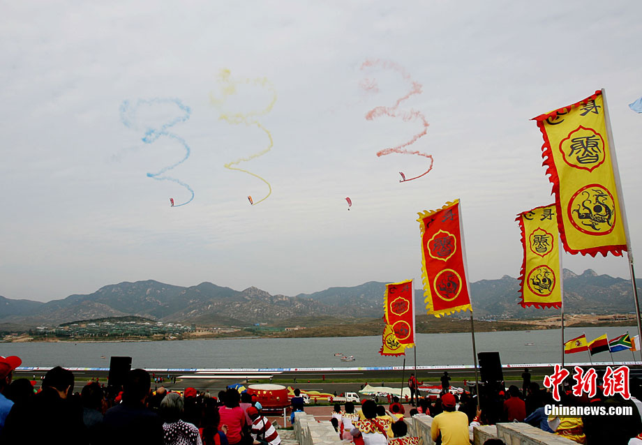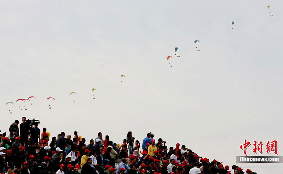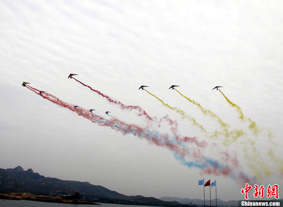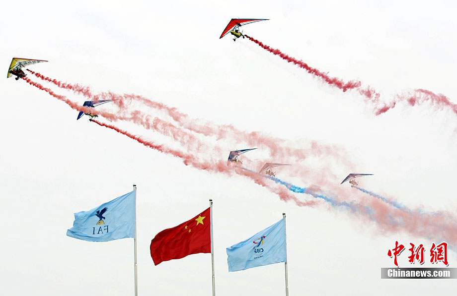 9月25日下午,2010中國國際航空體育節(jié)在山東省萊蕪市雪野旅游區(qū)拉開帷幕。來自世界18個國家的700余名航空體育高手匯聚“航空運動之城”萊蕪,以天空為舞臺,奉獻(xiàn)了一場精彩的航空體育盛會。圖為三角翼飛行器當(dāng)空舞彩練。 中新社發(fā) 馬圣泉 攝