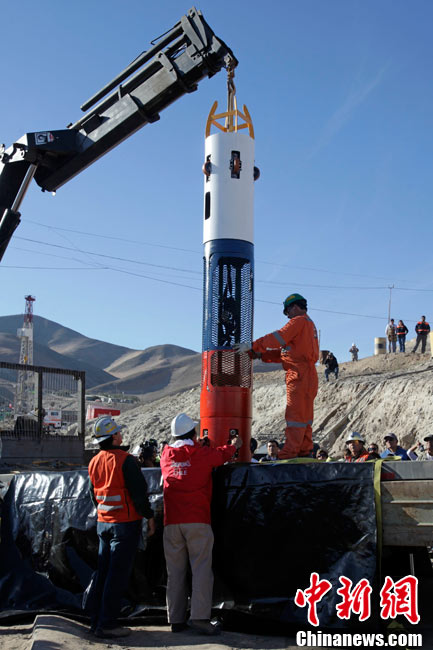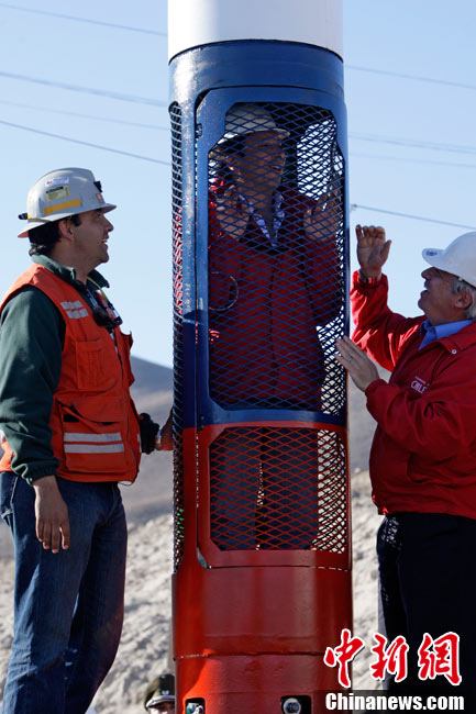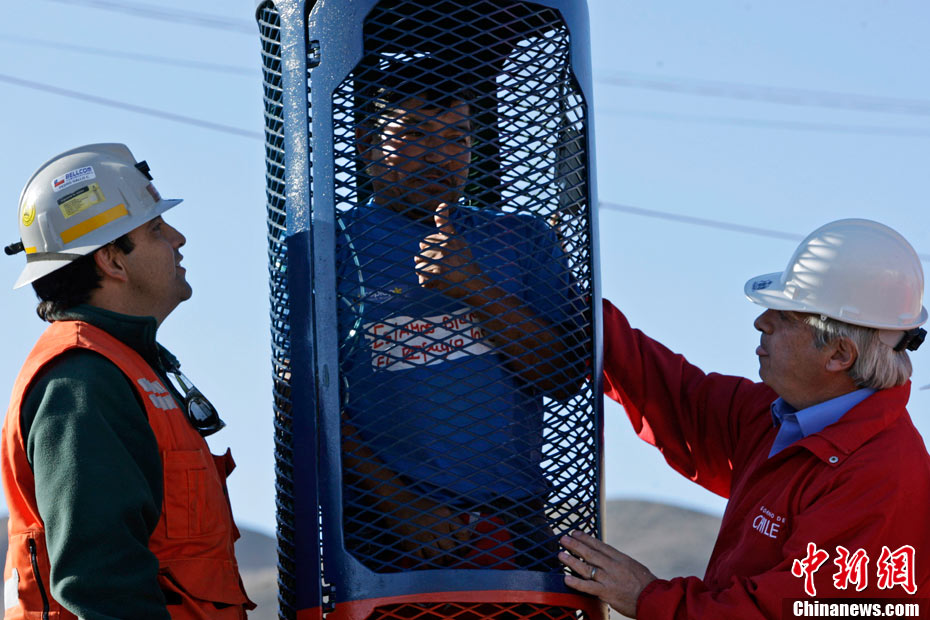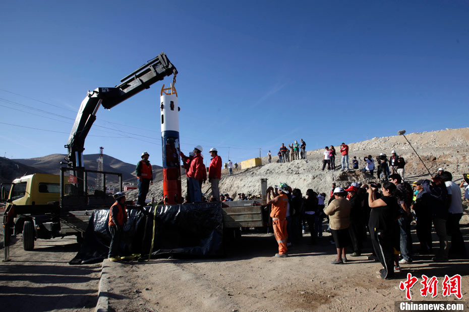 被困礦工的家屬在現(xiàn)場第一時間見到了救生艙,他們高興的鼓起掌來。這個救生艙重約420公斤,被命名為“鳳凰艙”,寓意著礦工們將依靠它重獲新生。救生艙身被涂成紅白藍(lán)3種顏色,這是智利國旗的顏色。艙內(nèi)高度為1.9米。另據(jù)悉,這個子彈形的救生艙還備有氧氣瓶、逃生裝置和通訊設(shè)備等。