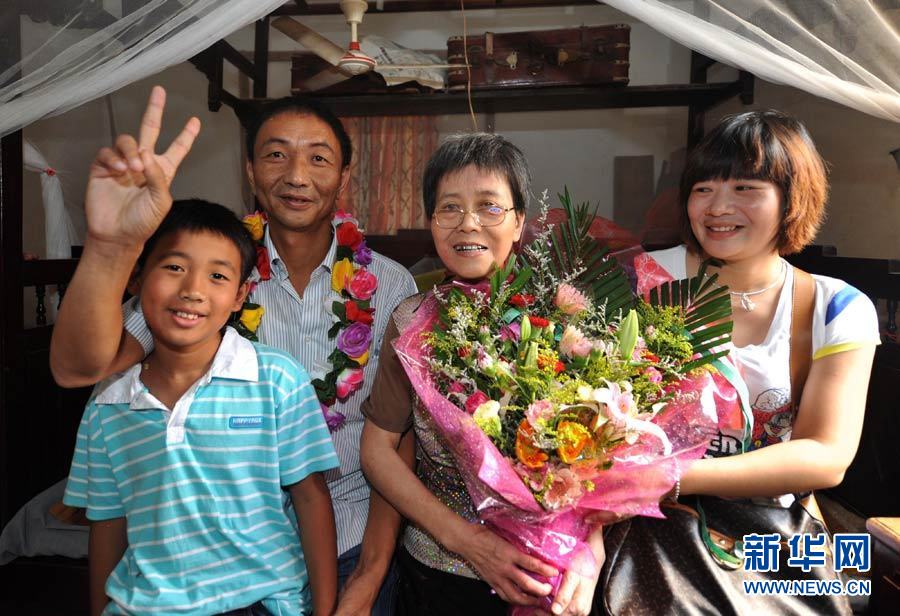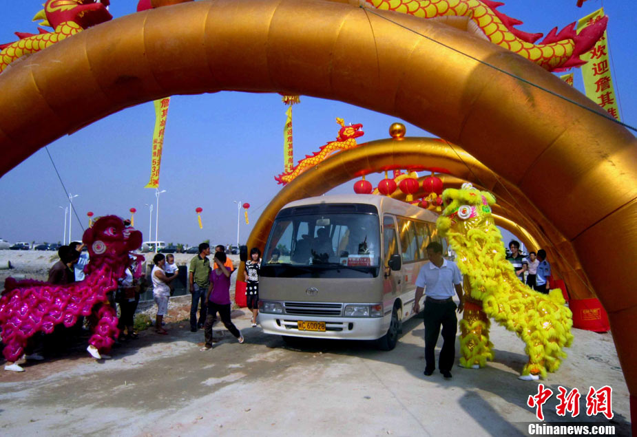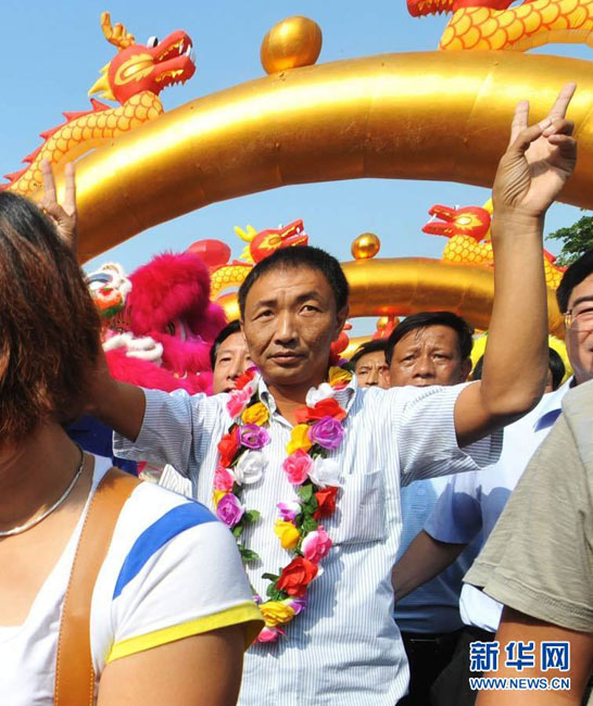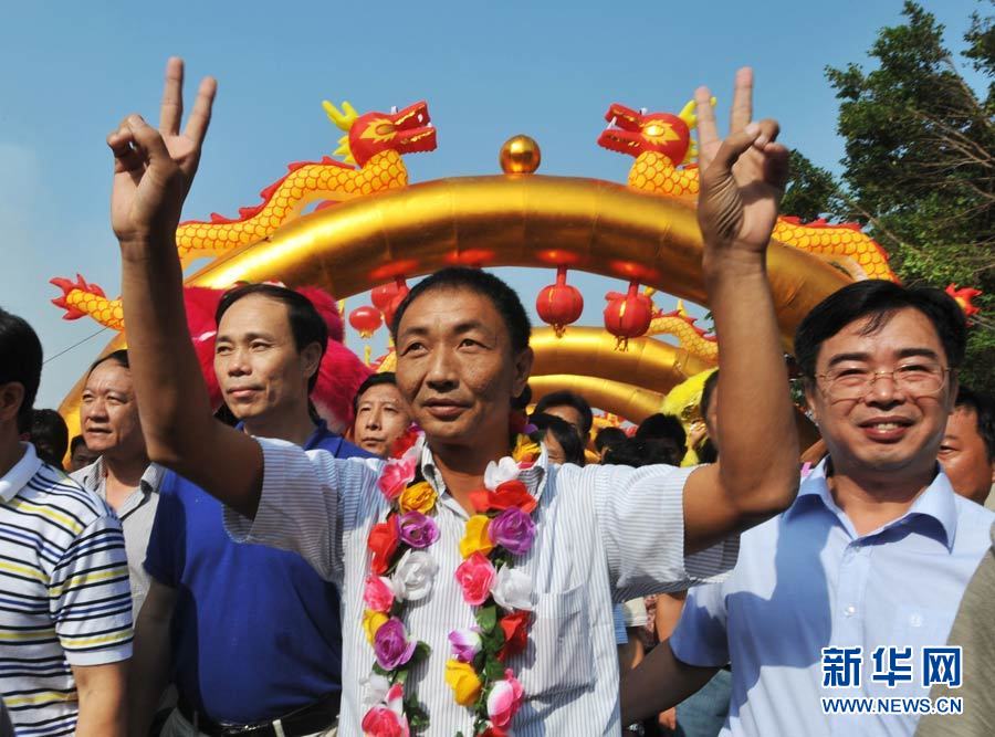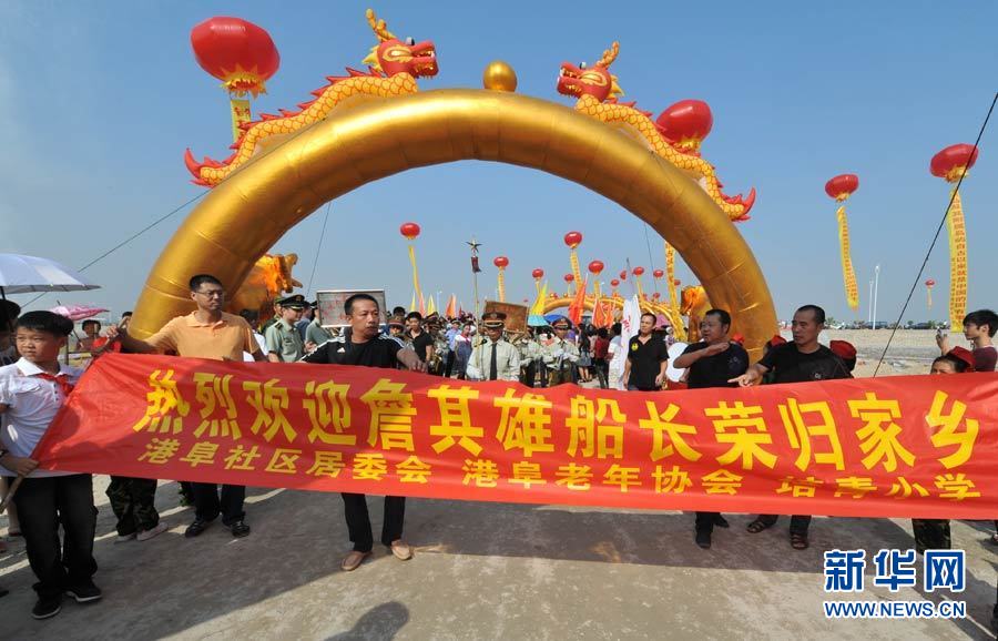 9月27日,被日方非法抓扣的中國漁船船長詹其雄返回家鄉(xiāng)--福建晉江市深滬鎮(zhèn)港滬村。當(dāng)?shù)剜l(xiāng)親熱情迎接他歸來。圖為詹其雄(圖中)下車后笑容滿面,受到了當(dāng)?shù)孛癖姷臒崃覛g迎。中新社發(fā) 孫虹 攝