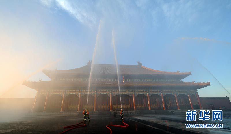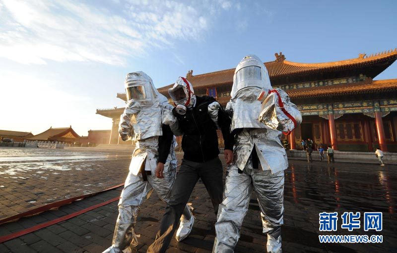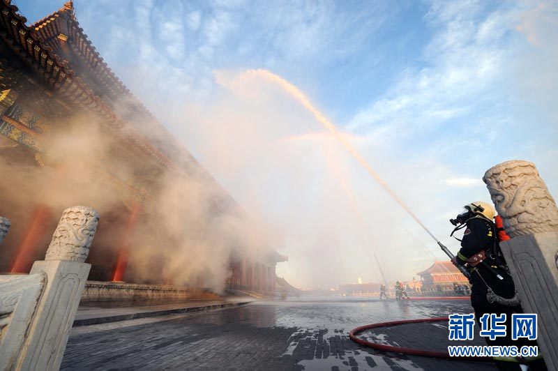 9月27日,北京消防部門在北京故宮太和殿舉行消防演習(xí)。北京消防部門開展多種形式的滅火救援演練,并加大演練的頻次和力度,保障今年“十一”長假期間的消防安全。李文 攝 圖片來源:新華網(wǎng)