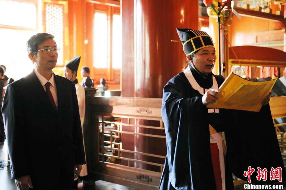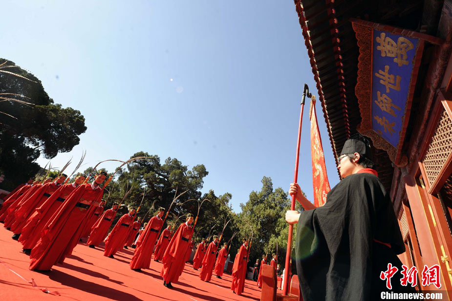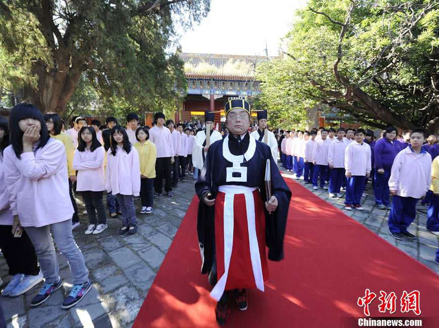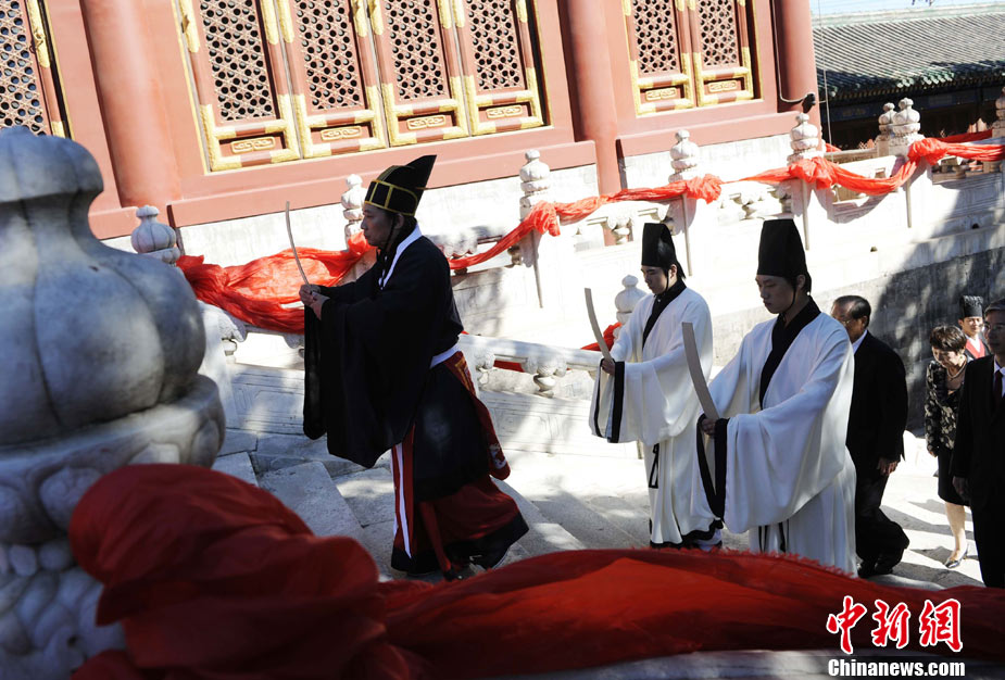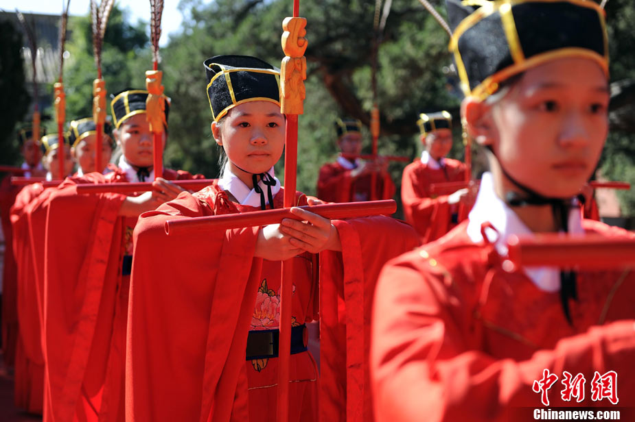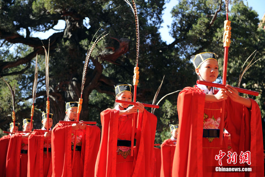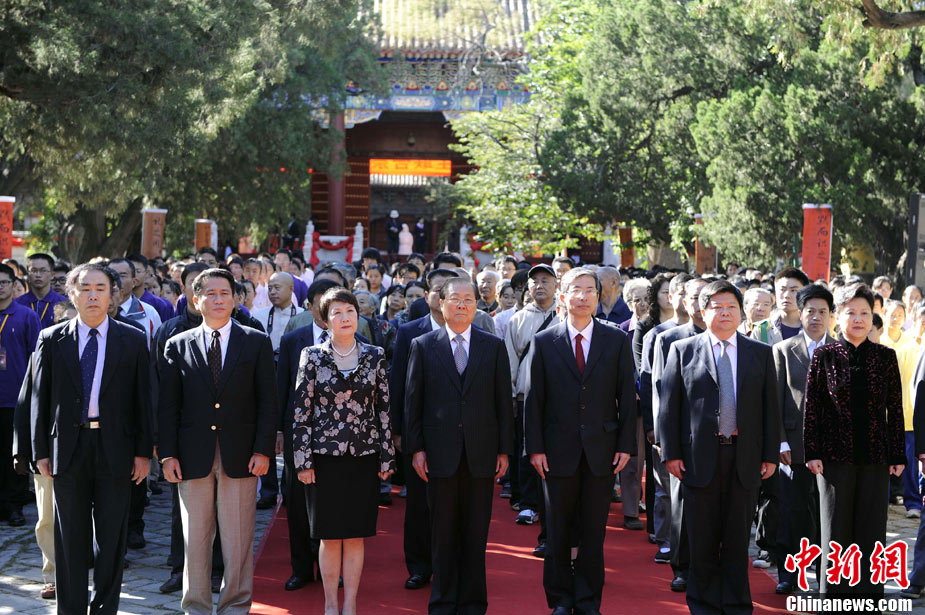 9月28日上午,兩岸師生聯(lián)合祭孔大典儀式在北京孔廟舉行。來自臺(tái)灣和北京的兩岸師生共計(jì)500人,共同祭奠孔子,弘揚(yáng)中華傳統(tǒng)文化。中新社記者 劉震 攝