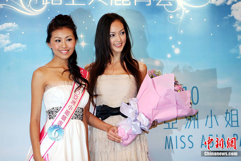 10月5日,參加《2010亞洲小姐競(jìng)選--港澳賽區(qū)》的佳麗在香港一家酒店登臺(tái)亮相,與大會(huì)形象顧問(wèn)團(tuán)成員會(huì)面。圖為6號(hào)佳麗李瑩瑩向形態(tài)顧問(wèn)Jessica C獻(xiàn)花。中新社發(fā) 洪少葵 攝