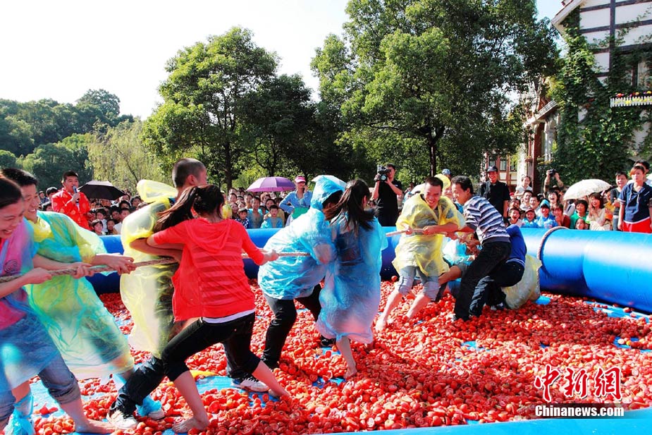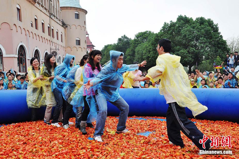 10月6日,艷陽高照的長沙世界之窗公園里,一群身著雨衣的年輕人在鋪滿西紅柿的池子里玩老鷹抓小雞的游戲,場(chǎng)面滑稽而激烈。國慶節(jié)期間,每天都有數(shù)千游客來這里參與“西紅柿大戰(zhàn)”,他們或用西紅柿互相“攻擊”,或玩拔河、老鷹抓小雞等游戲,盡情歡樂。中新社記者 肖前輝 攝