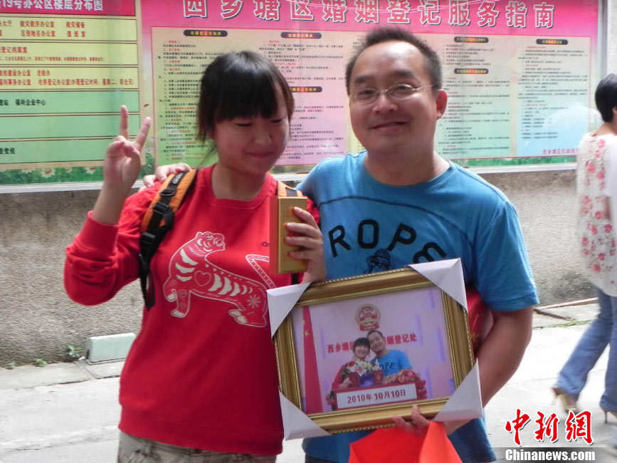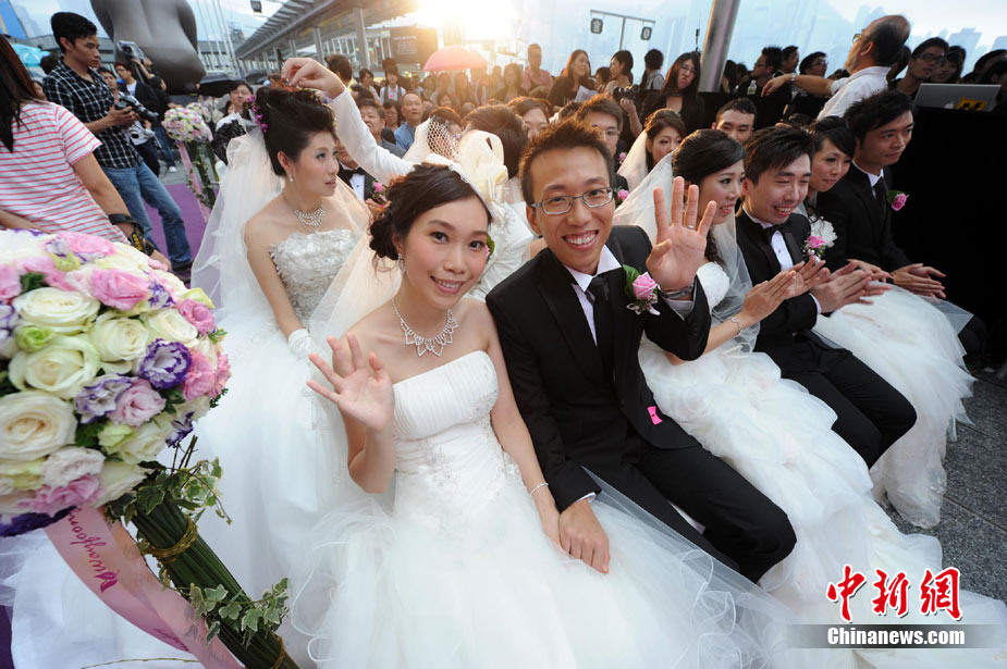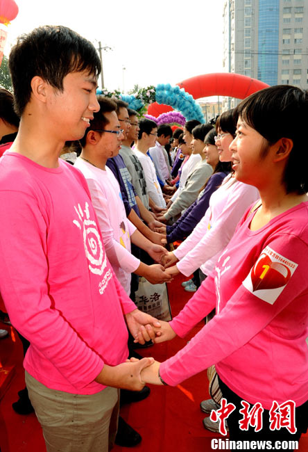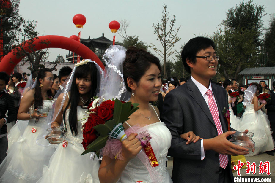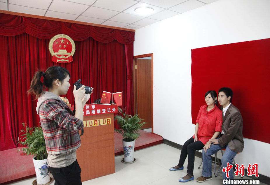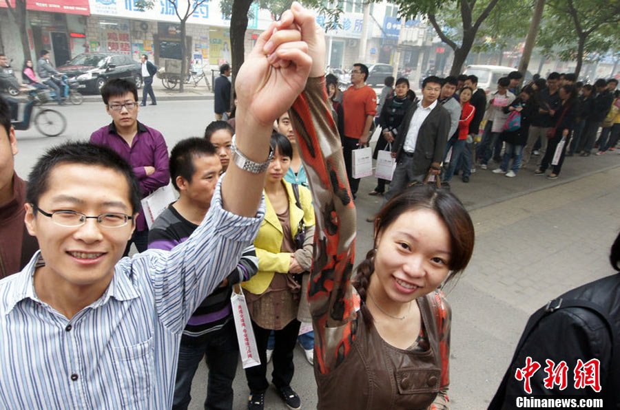 2010年10月10日,全國各地新人辦理結(jié)婚登記。很多新人選擇被寓意“十全十美”的好日子領(lǐng)結(jié)婚證。圖為鄭州出現(xiàn)結(jié)婚登記高峰,導(dǎo)致各區(qū)民政局婚姻登記處門前都排起長長的隊伍。一對新人在長長的隊伍中手挽手排除等候。沙浪 攝 圖片來源:CFP視覺中國