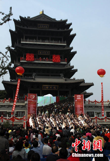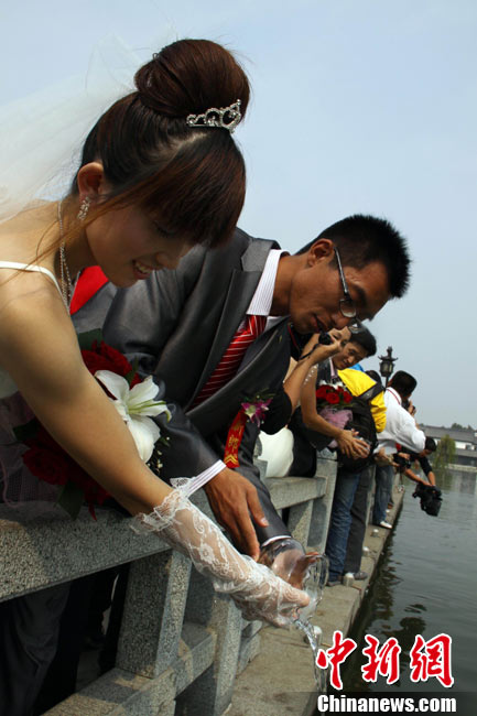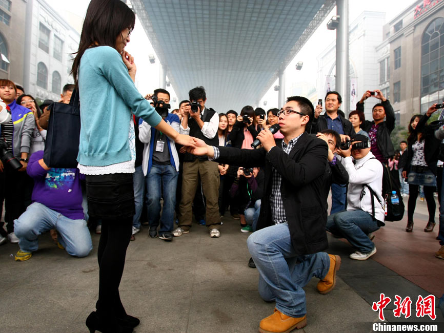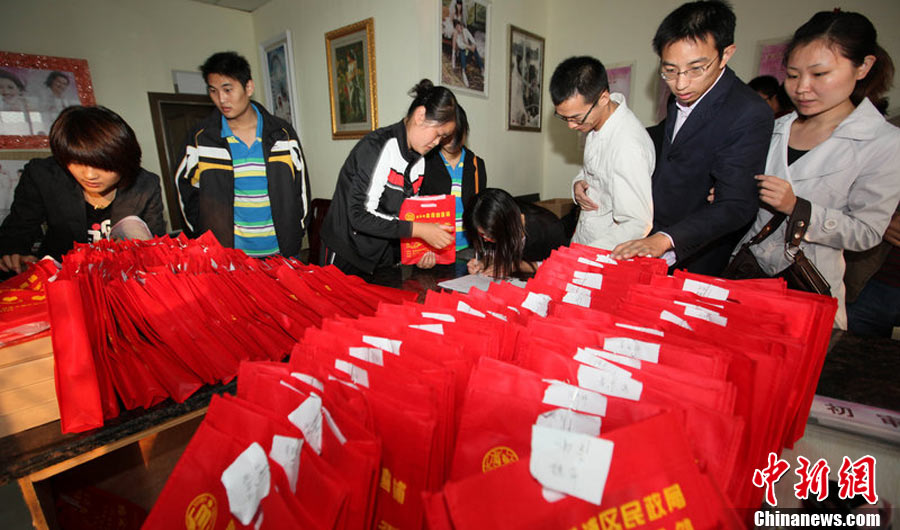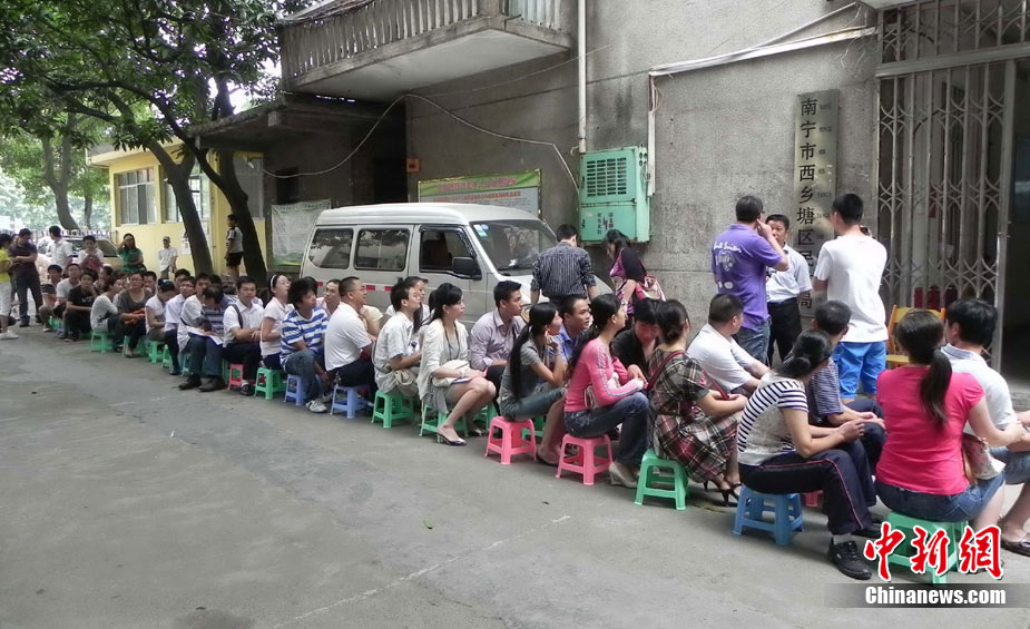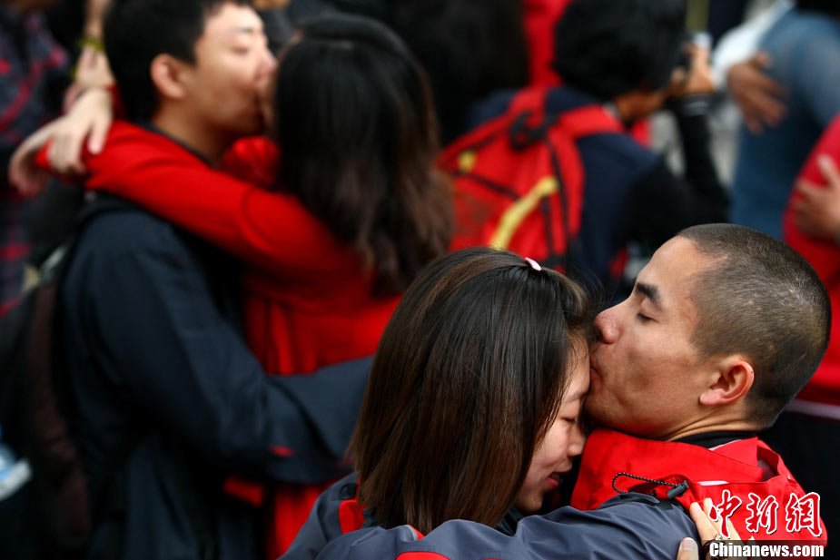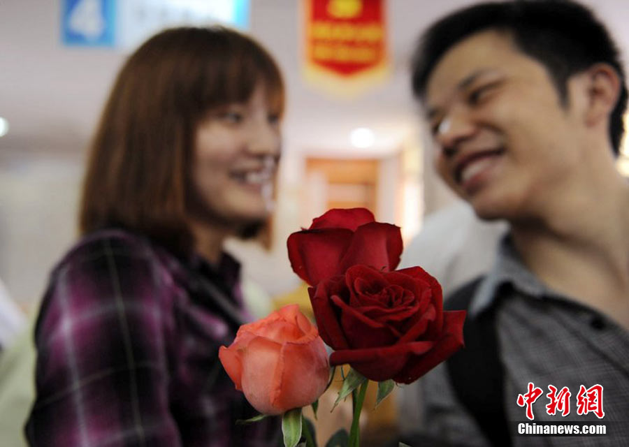 2010年10月10日,全國各地新人辦理結(jié)婚登記。很多新人選擇被寓意“十全十美”的好日子領(lǐng)結(jié)婚證。圖為鄭州出現(xiàn)結(jié)婚登記高峰,導(dǎo)致各區(qū)民政局婚姻登記處門前都排起長長的隊伍。一對新人在長長的隊伍中手挽手排除等候。沙浪 攝 圖片來源:CFP視覺中國