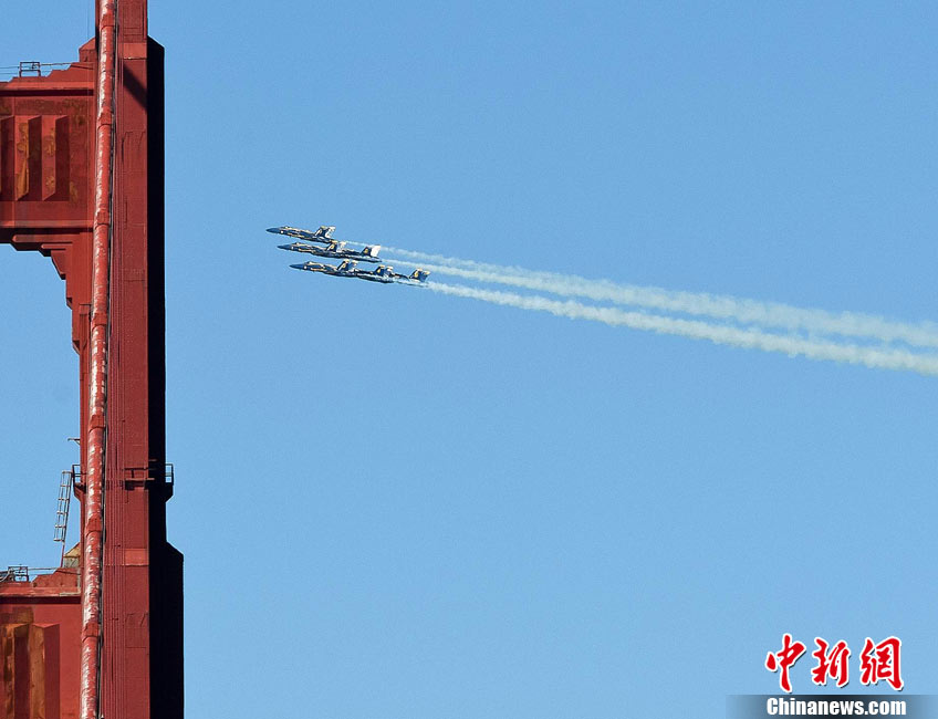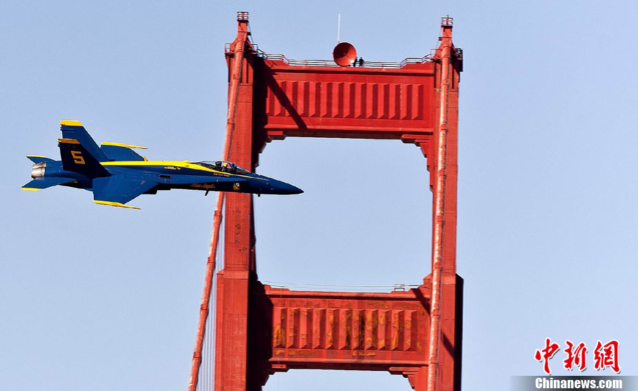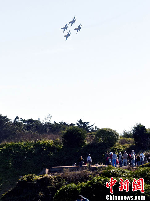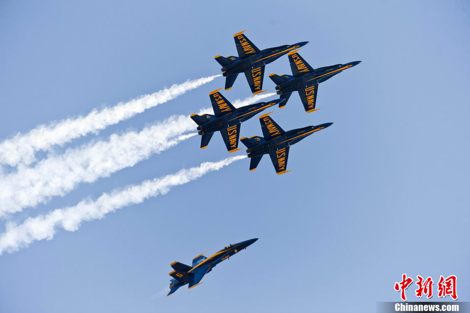 當(dāng)?shù)貢r(shí)間10月9日下午,美國(guó)海軍藍(lán)天使飛行表演隊(duì)在舊金山舉行一年一度的“艦隊(duì)周”活動(dòng)。圖為5架F-18戰(zhàn)斗機(jī)編隊(duì)表演。 中新社發(fā) 陳鋼 攝