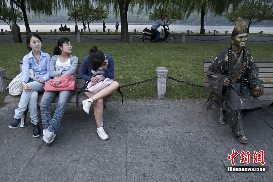 2010年10月上旬,一名打扮成濟公模樣的人在浙江省杭州市西湖白堤和游客合影,“濟公”身上涂滿了銅顏色的彩繪,看上去像雕塑一樣。據(jù)悉,這位20多歲“濟公”來自江蘇,從今年春天開始扮成“濟公”,在全國游走。和他合影需要交5元錢。許康平 攝 圖片來源:cnsphoto