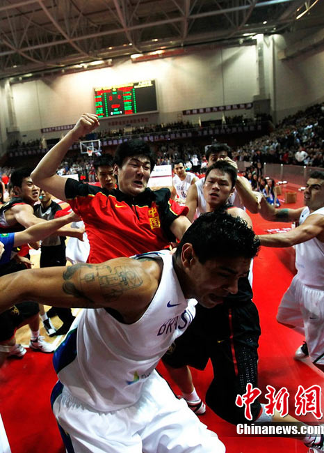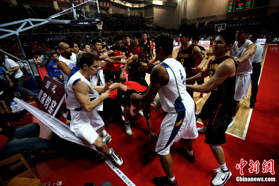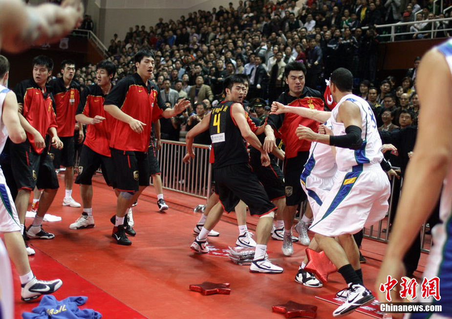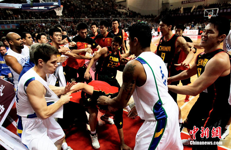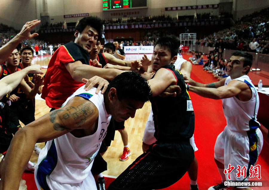 10月12日,河南許昌,2010男籃亞運(yùn)熱身賽第3場,中國Vs巴西。雙方發(fā)生摩擦,爆發(fā)群毆。圖片來源:CFP視覺中國