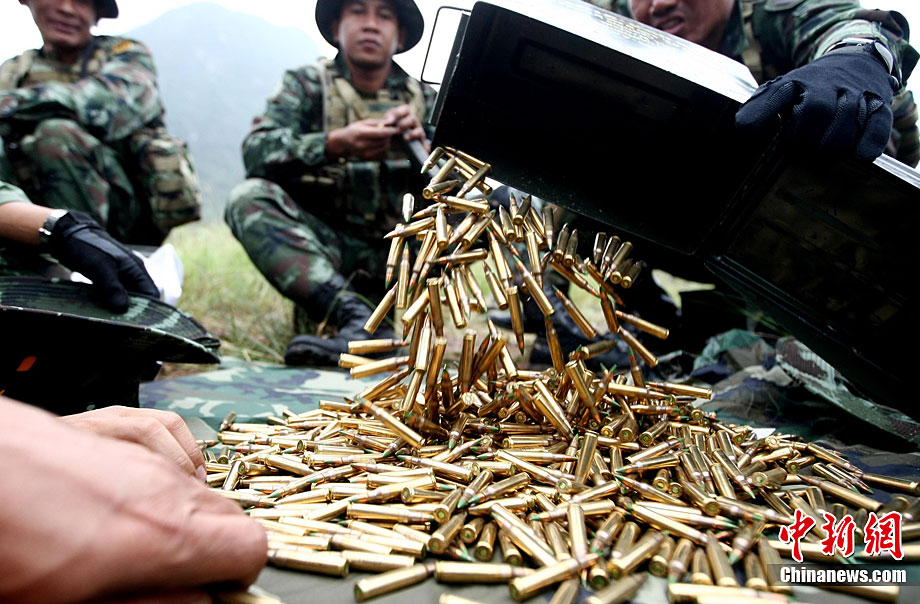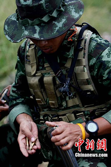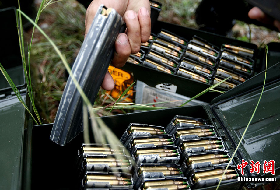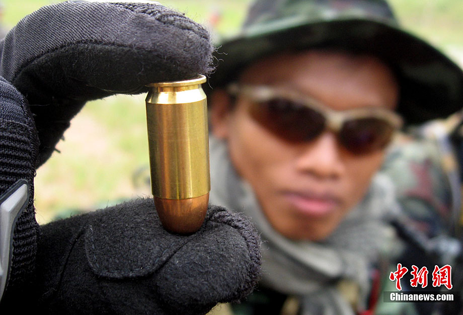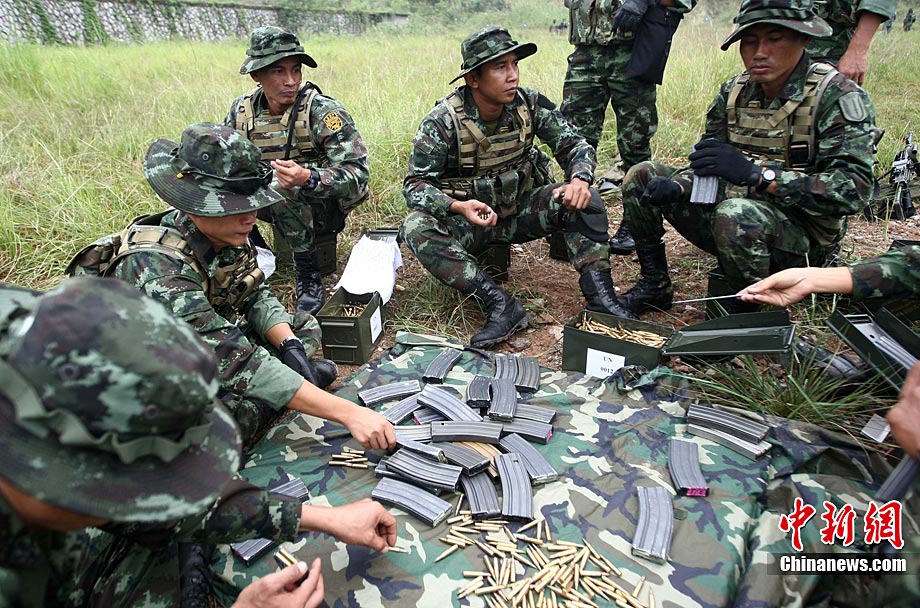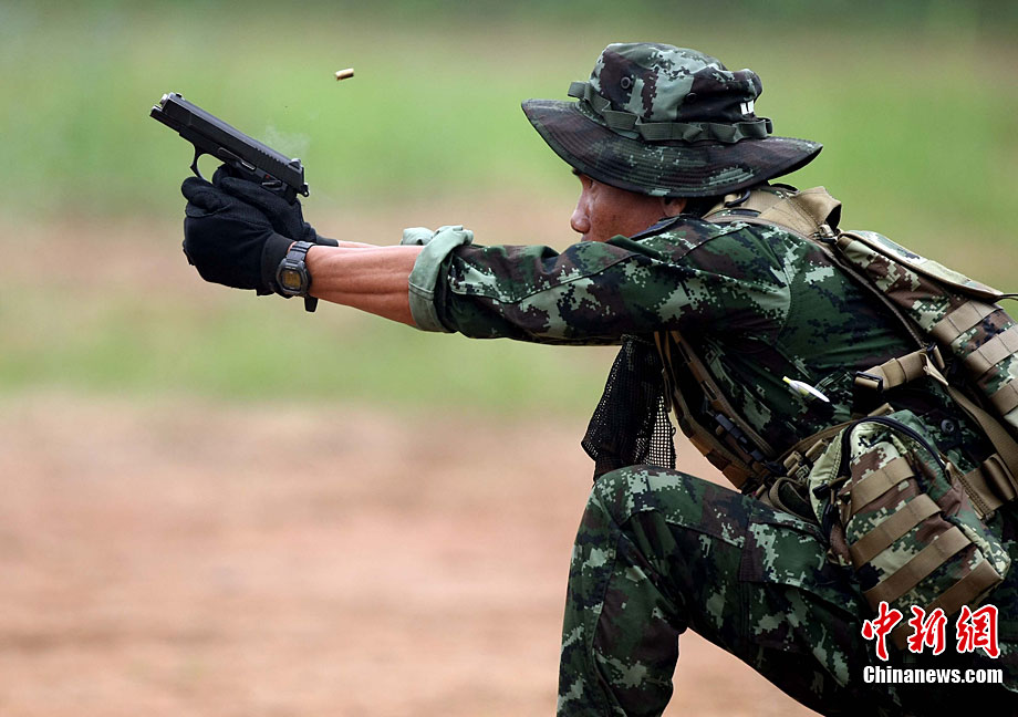 “突擊-2010”中泰陸軍特種部隊(duì)反恐聯(lián)合訓(xùn)練10月6日至20日在廣西壯族自治區(qū)桂林進(jìn)行。中泰雙方將各派出60余人的特種分隊(duì)參加訓(xùn)練。此次聯(lián)合訓(xùn)練分展示交流、混編同訓(xùn)和綜合演練三個(gè)階段,主要圍繞城市反恐基礎(chǔ)技能訓(xùn)練、混編分隊(duì)?wèi)?zhàn)術(shù)訓(xùn)練等科目進(jìn)行。圖為泰方隊(duì)員M16步槍實(shí)彈速射。中新社記者 杜洋 攝
