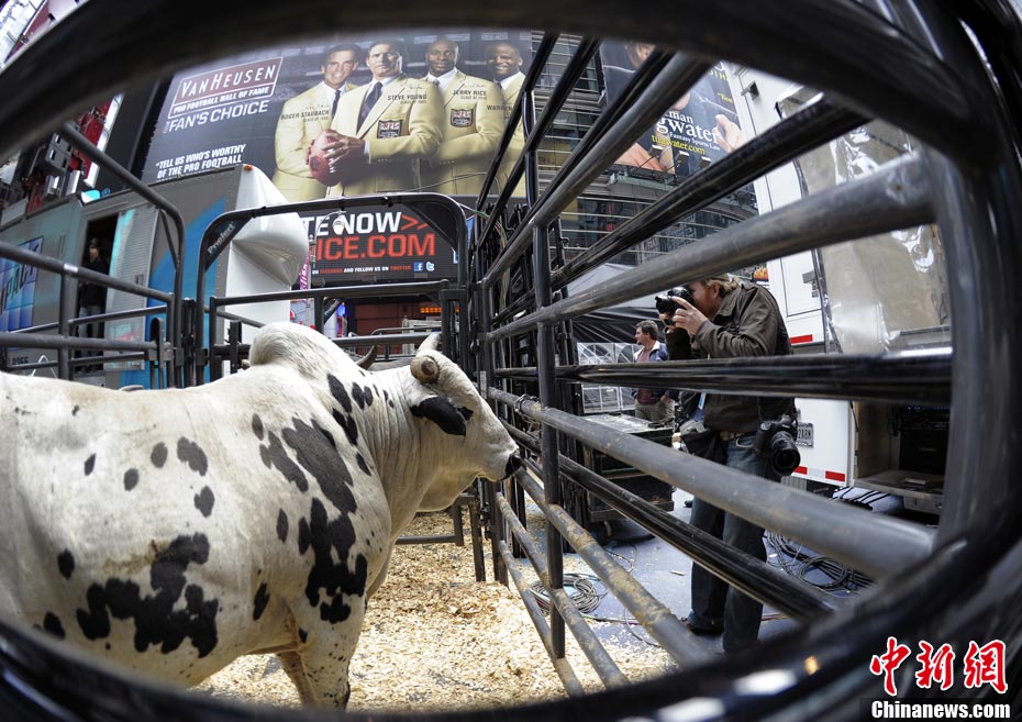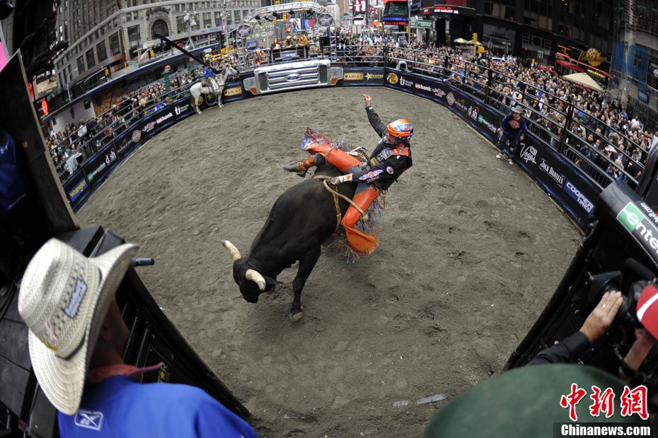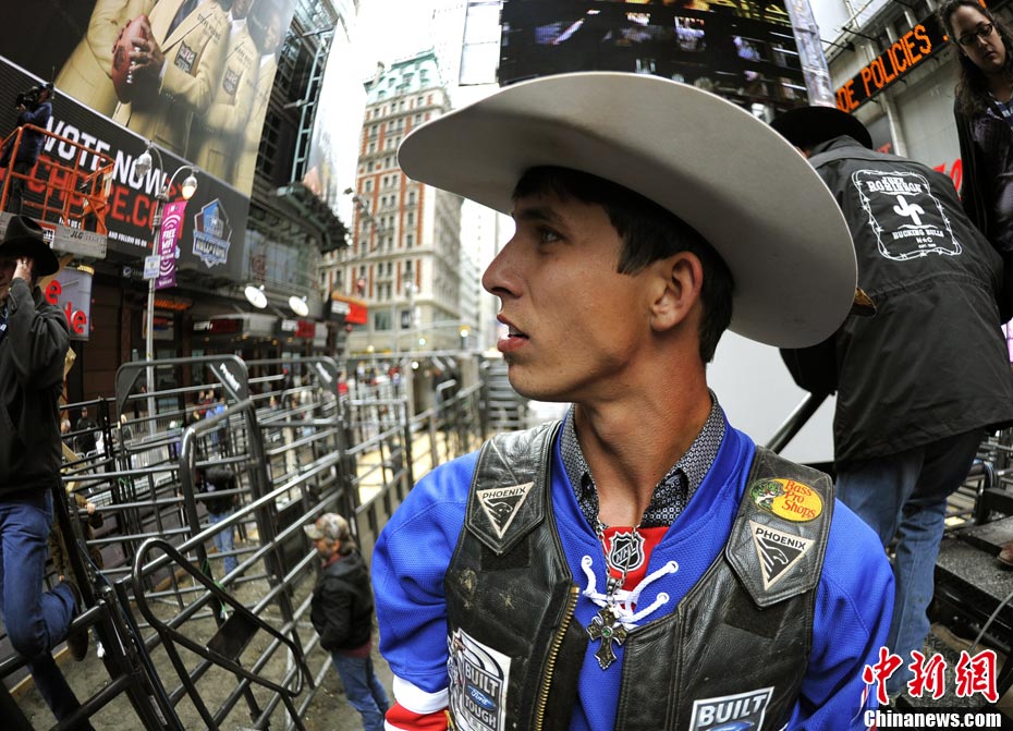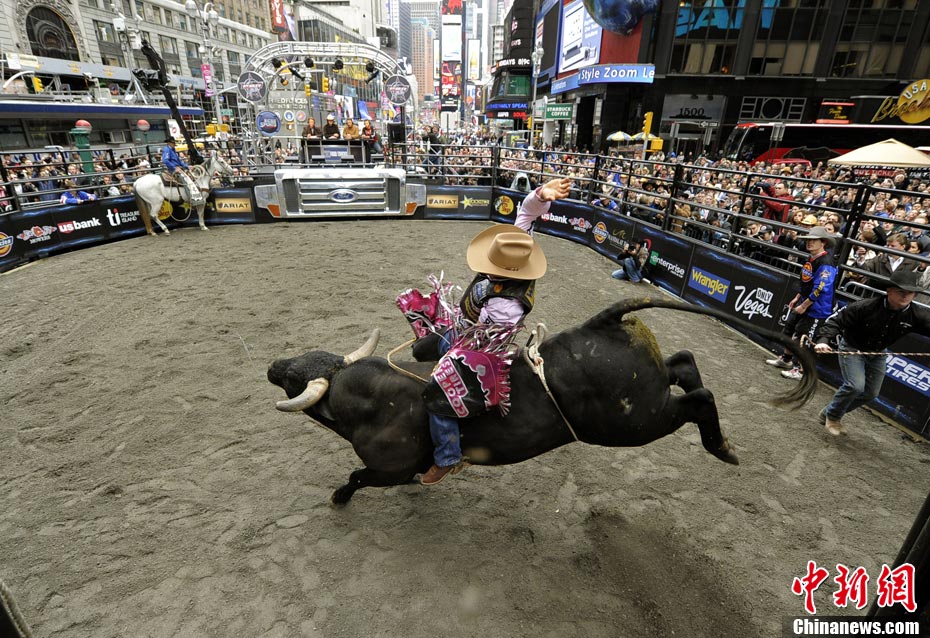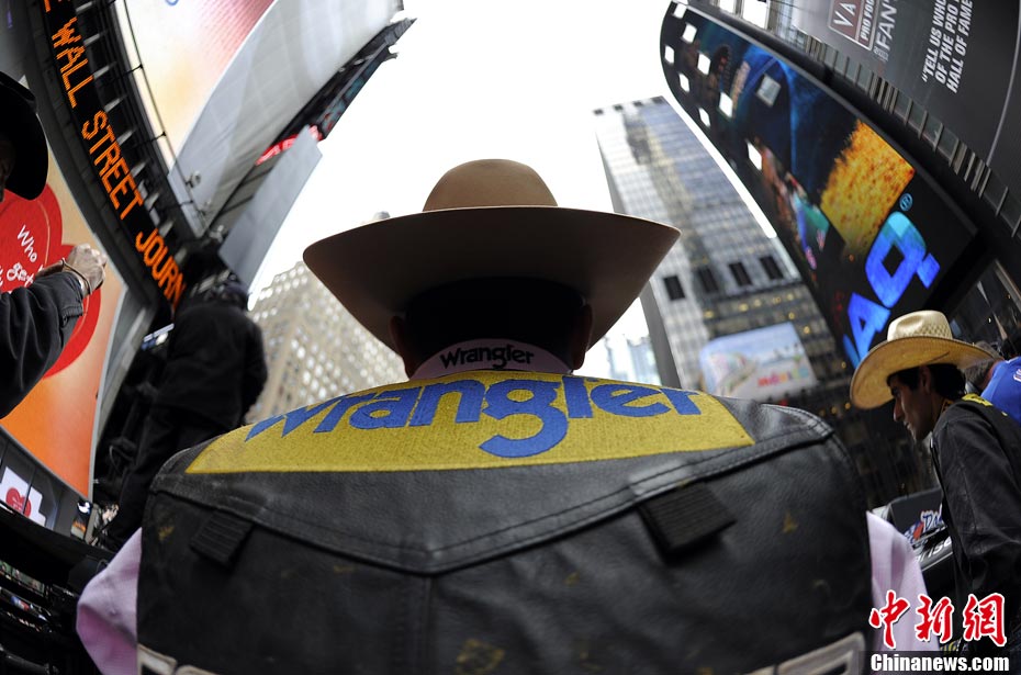 當(dāng)?shù)貢r(shí)間10月15日,10名美國(guó)職業(yè)騎牛大賽的頂尖選手在紐約時(shí)報(bào)廣場(chǎng)上演了一場(chǎng)精彩的騎牛大賽,為將于10月20日至24日在美國(guó)拉斯維加斯舉行的2010職業(yè)騎牛總決賽造勢(shì)。