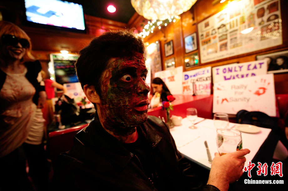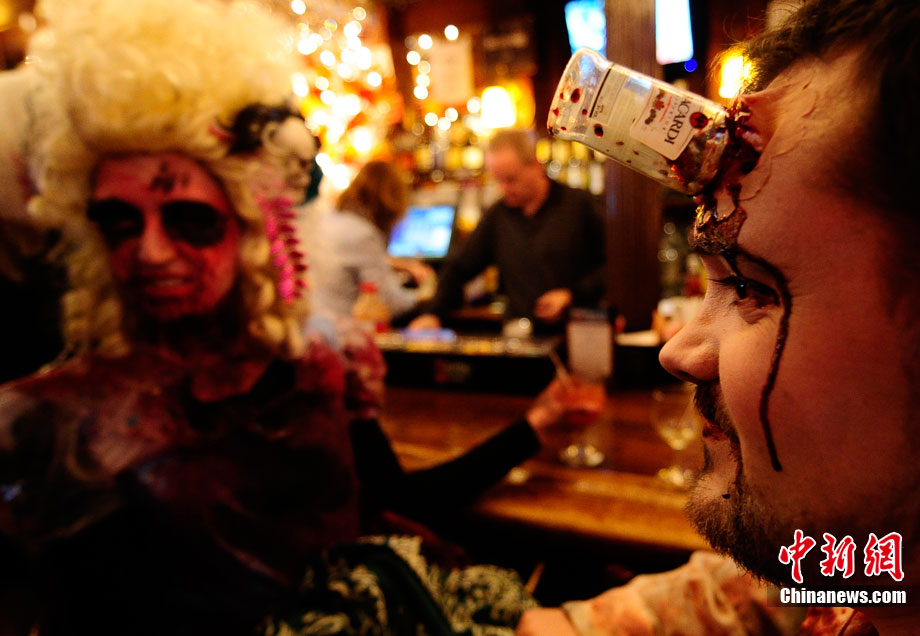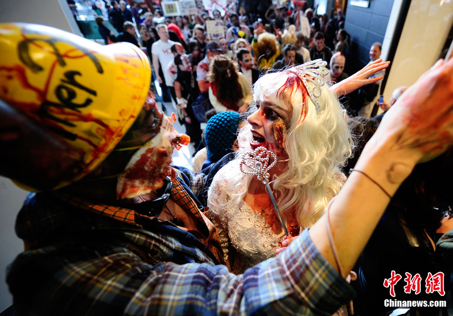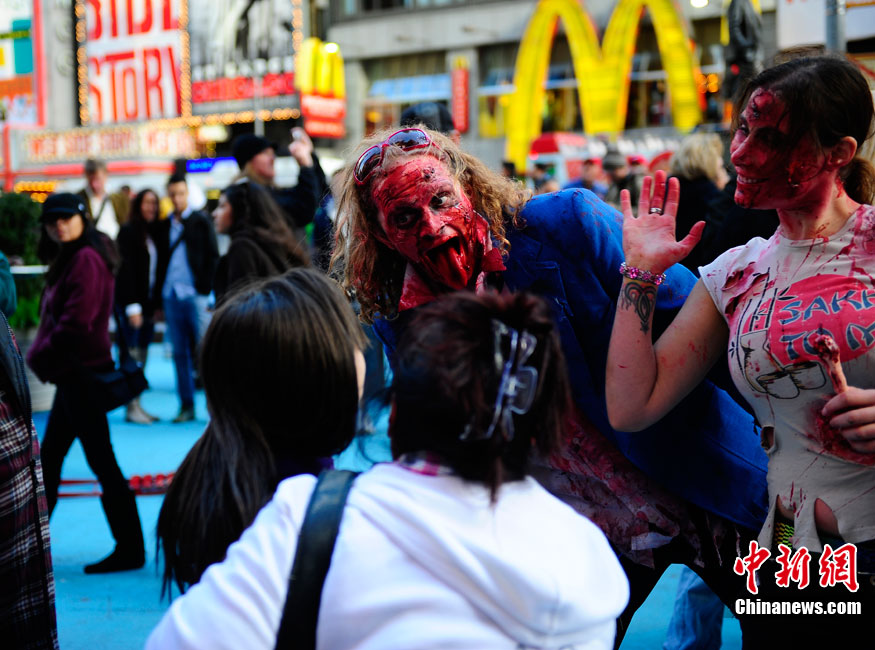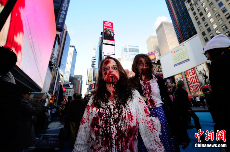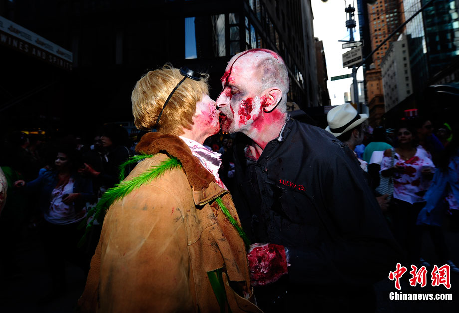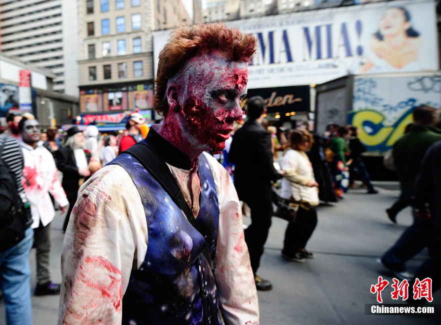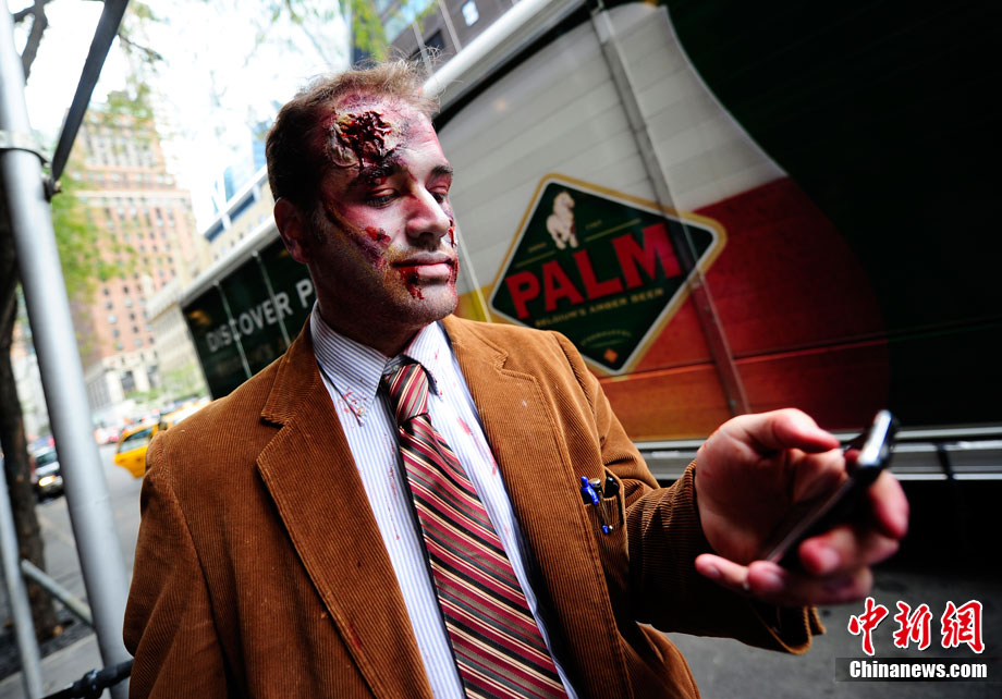 當?shù)貢r間10月16日,美國紐約曼哈頓舉行了盛大的僵尸大游行。數(shù)百名狂歡者將自己打扮成僵尸模樣嚇唬路上的民眾。