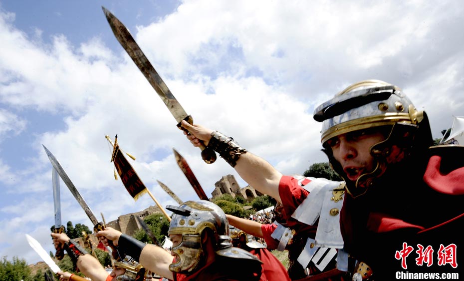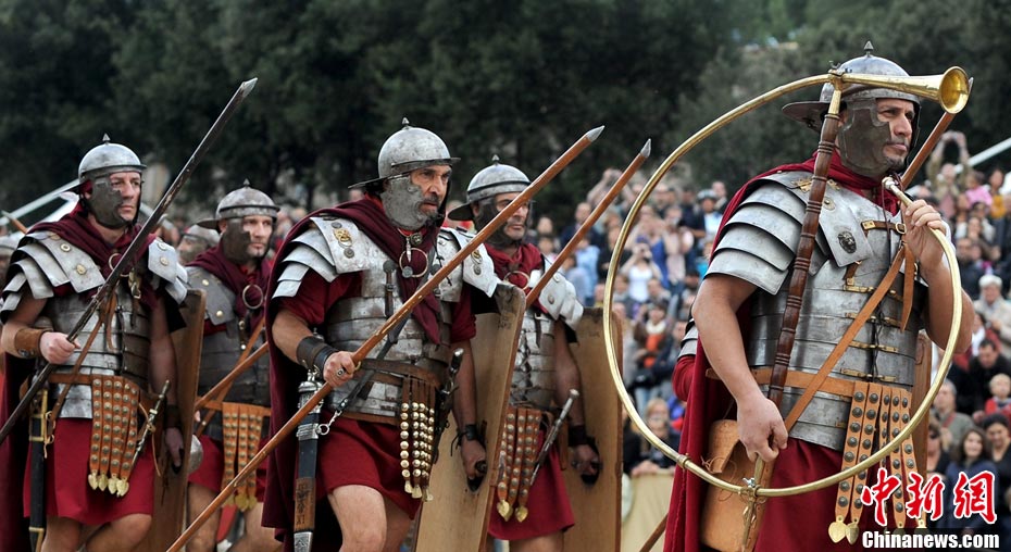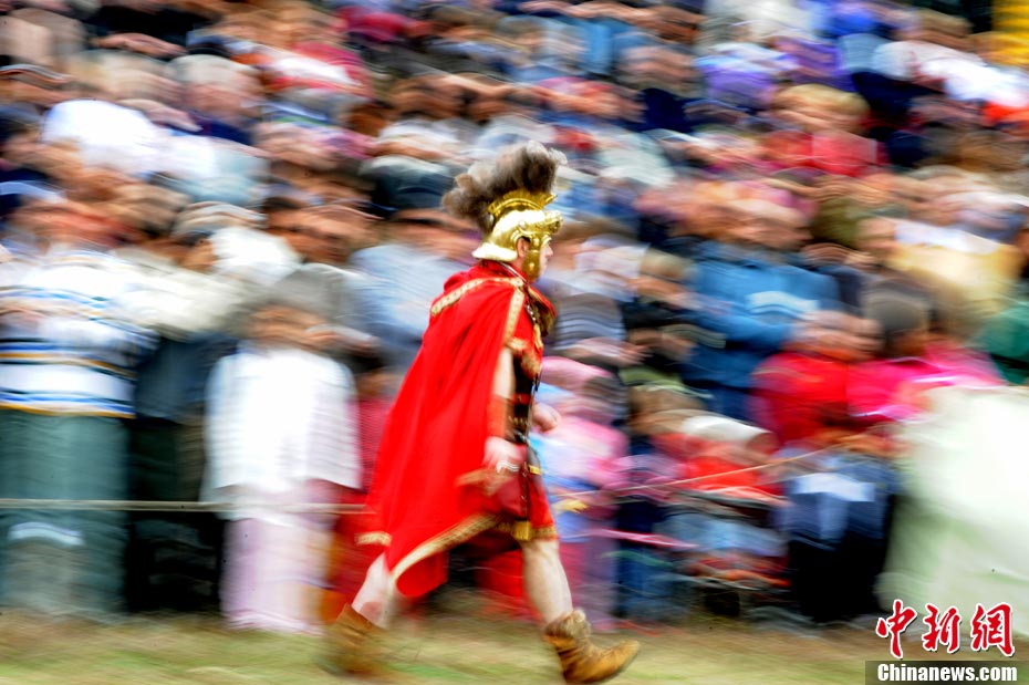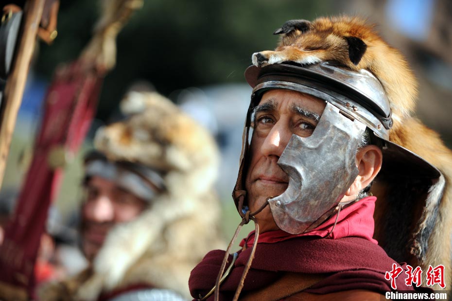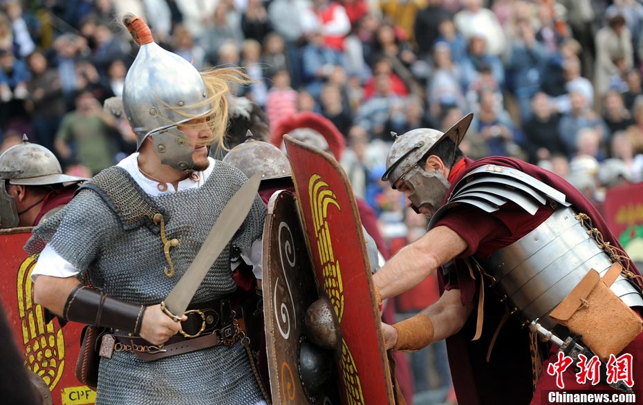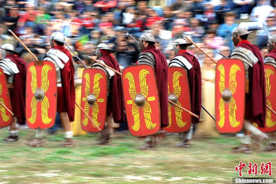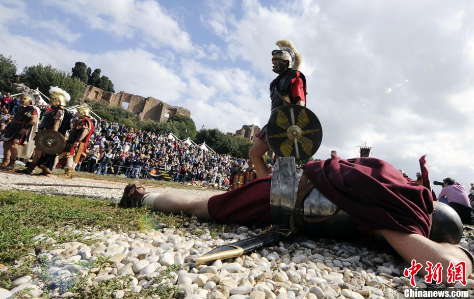當(dāng)?shù)貢r間2010年10月17日,意大利羅馬的歷史愛好者和演員們再現(xiàn)了“古羅馬軍團(tuán)”和凱爾特人戰(zhàn)斗的場景,表演吸引了大批觀眾到場觀看。