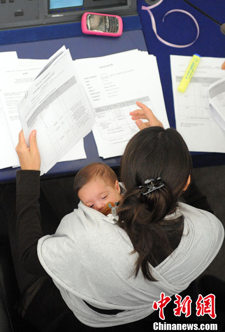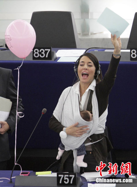 10月20日,歐洲議會(huì)在法國的斯特拉斯堡為延長(zhǎng)產(chǎn)假的提案舉行投票,代表麗希亞·隆蘇依帶著孩子出席會(huì)議。