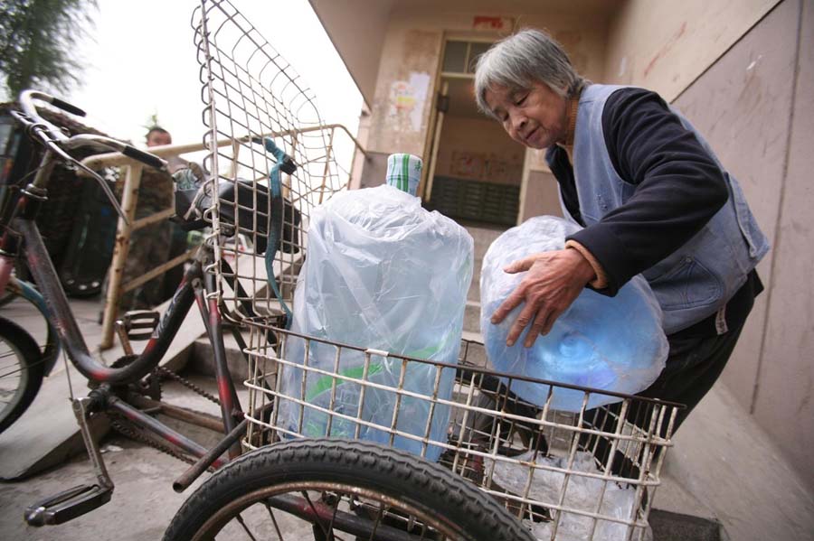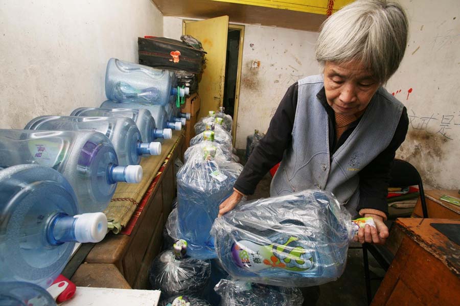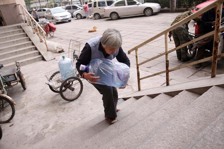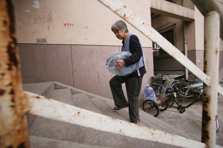 每天早晚都是送水高峰,不論是早上6點還是晚上10點,不論刮風(fēng)下雨,只要顧客一個電話,老人便會送水上門。長時間的搬運,導(dǎo)致她的背駝得十分嚴(yán)重。老人寫信委托本報尋求好心人的救助,幫自己的兒孫治病,渡過難關(guān)。王璐 攝/林暉 圖片來源:新華網(wǎng)