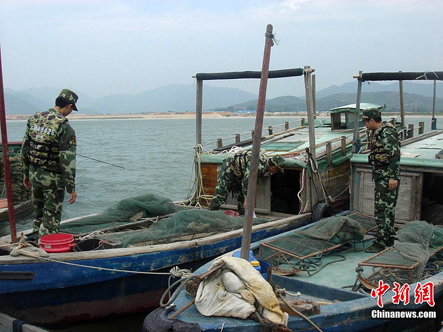 超強(qiáng)臺(tái)風(fēng)“鲇魚”來(lái)勢(shì)兇猛,惠州沿海區(qū)域有可能正面遭受臺(tái)風(fēng)的沖擊。目前,邊防部門已做好孤寡老人等群體登記工作,礦泉水、面包等應(yīng)急物資也已到位。圖為10月20日,邊防官兵對(duì)靠岸避風(fēng)漁船逐船進(jìn)行檢查。中新社發(fā) 肖桔川 攝