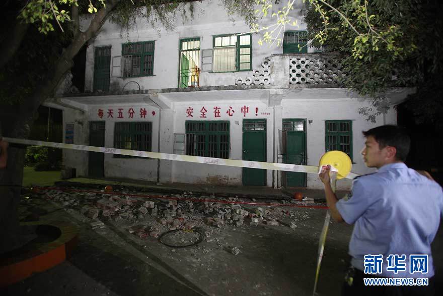 10月21日,警方在發(fā)生護(hù)欄坍塌事故的教學(xué)樓外拉起警戒線。當(dāng)日下午4時(shí)40分左右,廣西柳江縣洛滿鎮(zhèn)洛滿中心小學(xué)一棟兩層教學(xué)樓二樓走廊護(hù)欄發(fā)生坍塌事故。截至21日晚9時(shí),共有27名學(xué)生墜落不同程度受傷,4人傷勢較嚴(yán)重。