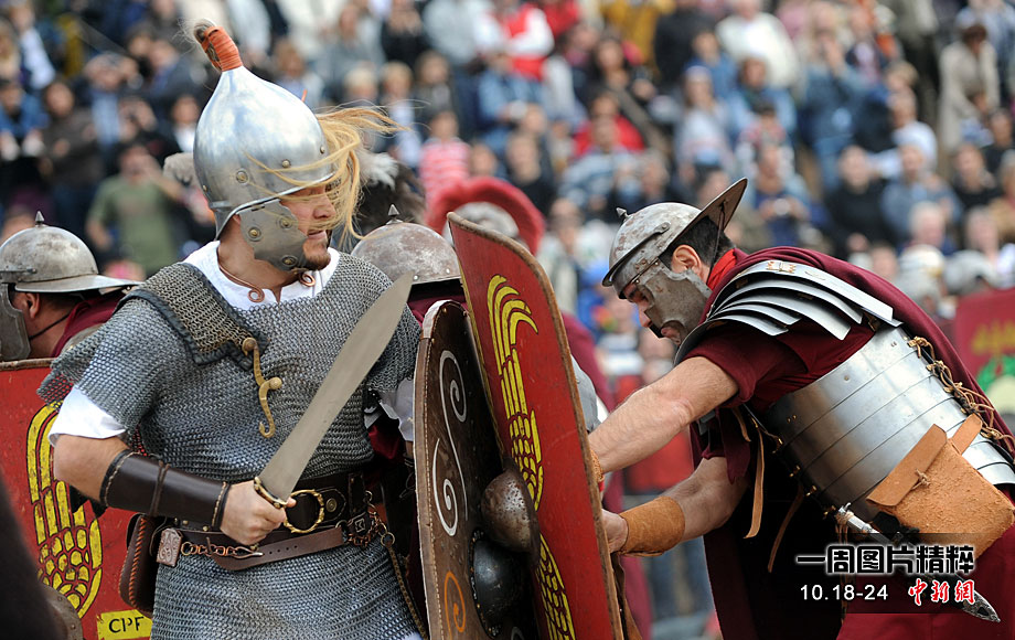 當(dāng)?shù)貢r(shí)間2010年10月17日,意大利羅馬的歷史愛(ài)好者和演員們?cè)佻F(xiàn)了“古羅馬軍團(tuán)”和凱爾特人戰(zhàn)斗的場(chǎng)景,表演吸引了大批觀眾到場(chǎng)觀看。