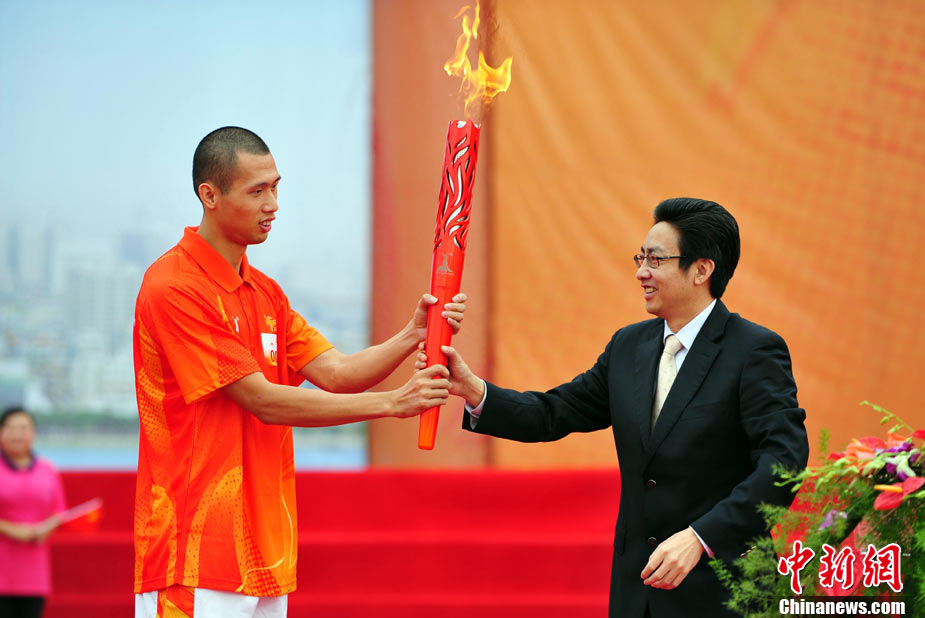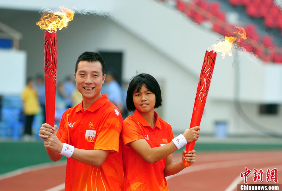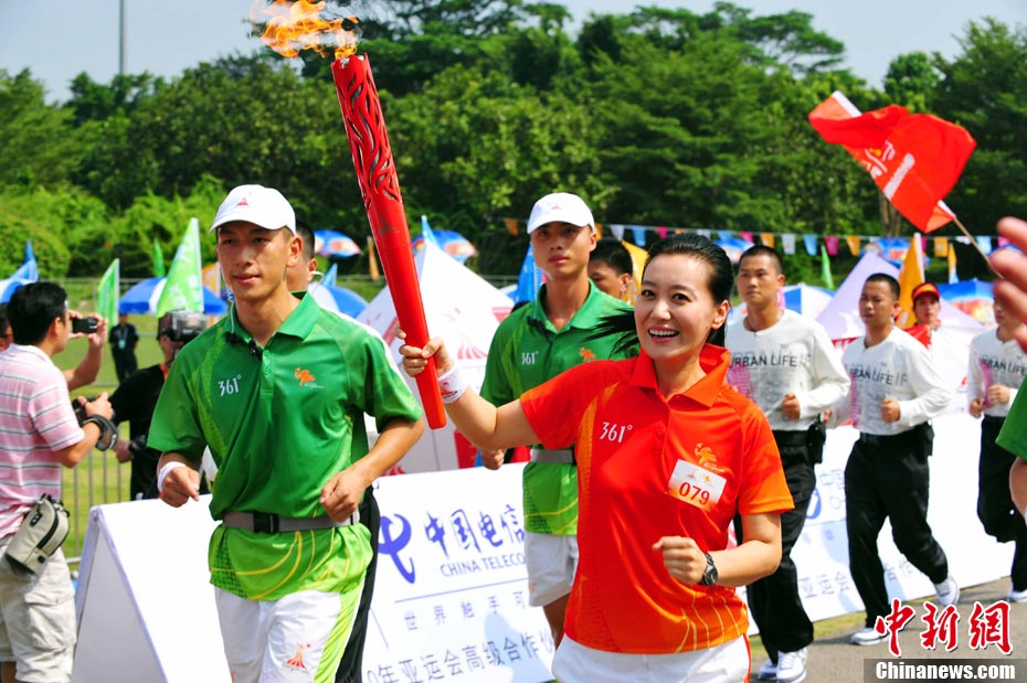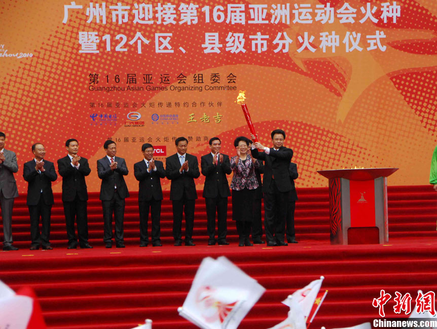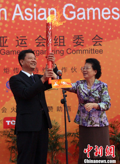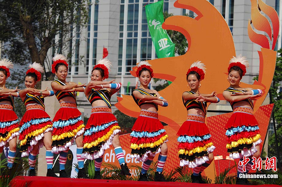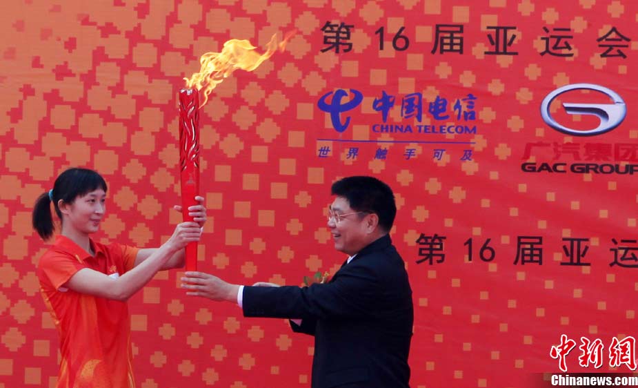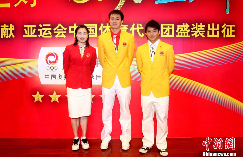 10月25日,第16屆亞運會中國體育代表團禮儀服裝在北京國家體育總局新聞廳正式發(fā)布。服裝采用經(jīng)典紅、黃兩色,寓意恒久美好。圖為運動員張琳、吳敏霞、何沖展示代表團禮儀服裝。 中新社記者 杜洋 攝