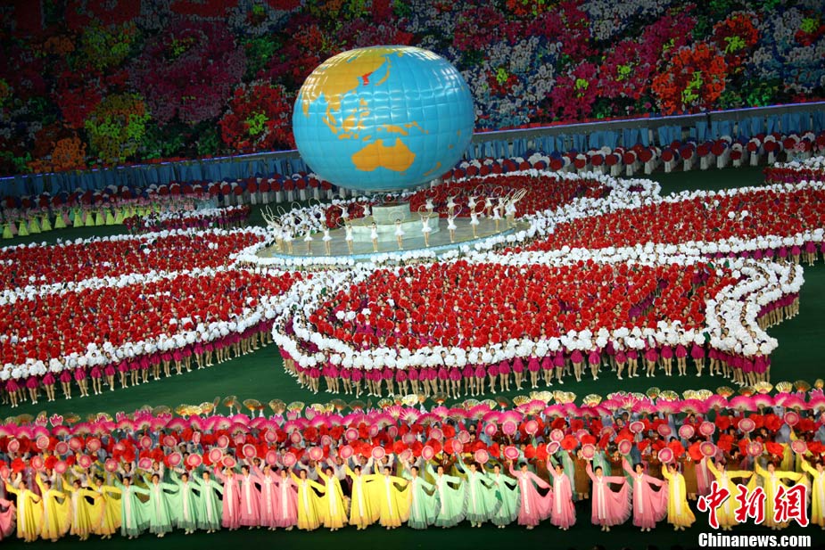 10月23日,朝鮮在平壤“五一”體育場為紀(jì)念中國人民志愿軍入朝參戰(zhàn)60周年舉辦大型團(tuán)體操和藝術(shù)表演《阿里郎》。 中新社記者 孫自法 攝