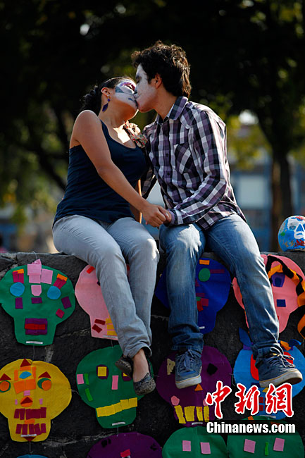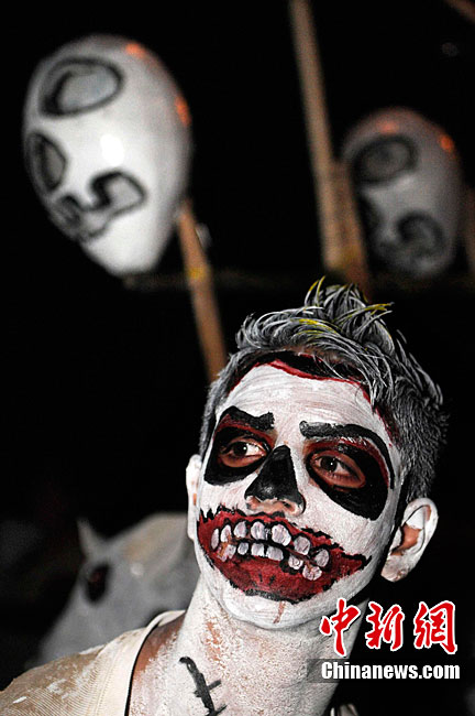 當(dāng)?shù)貢r(shí)間11月2日,拉丁美洲各國(guó)紛紛迎來(lái)傳統(tǒng)節(jié)日——亡靈節(jié)。按照當(dāng)?shù)仫L(fēng)俗,11月1日是“幼靈”節(jié);2日是“成靈”節(jié)。人們?cè)谀沟赝ㄍ迩f或者小鎮(zhèn)的路上撒了黃色的花瓣,讓亡靈循著芬芳的小路歸來(lái)。晚間,在家門(mén)口點(diǎn)上南瓜燈籠,為亡靈上門(mén)引路;在祭壇上擺著玉米羹、巧克力、面包、粽子、辣醬、南瓜、甜食、甜點(diǎn)等供品,讓亡靈享用。節(jié)日里,無(wú)分男女老幼,都可以戴著面具,穿上印著白骨的鬼怪衣服,在街上招搖過(guò)市,表示亡靈歸來(lái)。 圖為墨西哥民眾慶祝亡靈節(jié)。