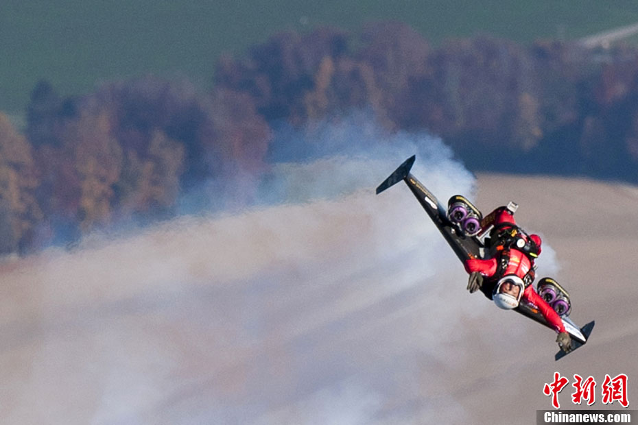 當?shù)貢r間2010年11月5日,瑞士貝爾謝“火箭人”伊夫-羅西使用裝有小型噴氣發(fā)動機的噴氣動力翼,首次完成空中翻轉(zhuǎn)特技。