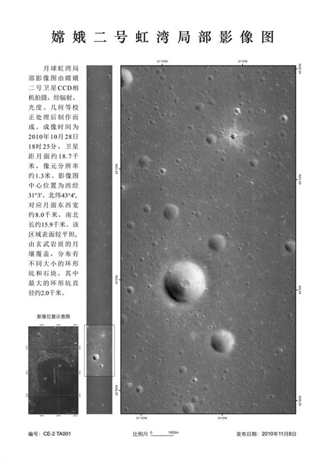 2010年11月8日,中國國家國防科技工業(yè)局首次公布嫦娥二號衛(wèi)星傳回的月球虹灣區(qū)域局部影像圖。這張月球虹灣局部影像圖成像時間為10月28日18時25分,衛(wèi)星距月面約18.7公里,分辨率約為1.3米。影像圖中心位置為西經(jīng)31度3分,北緯43度4分,對應(yīng)月面東西寬約8公里,南北長約15.9公里。影像圖顯示,該區(qū)域表面較平坦,由玄武巖質(zhì)的月壤覆蓋,分布有不同大小的環(huán)形坑和石塊,其中最大的環(huán)形坑直徑約2千米。影像圖的傳回,標(biāo)志著“嫦娥二號”任務(wù)所確定的六個工程目標(biāo)全部實現(xiàn),四個科學(xué)目標(biāo)也正在陸續(xù)實現(xiàn),探月工程二期“嫦娥二號”工程任務(wù)取得圓滿成功。 中新社發(fā) 國防科工局供圖