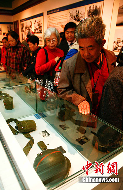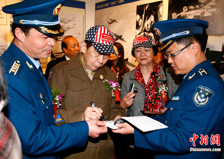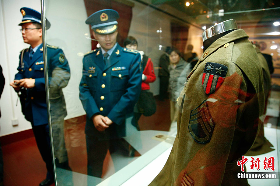 11月9日,由知名僑領(lǐng)陳燦培向昆明市捐贈的1100件飛虎隊文物在云南陸軍講武堂展出。創(chuàng)立于上個世紀(jì)40年代的飛虎隊,又稱中國空軍美國志愿援華航空隊。在抗日戰(zhàn)爭中對日作戰(zhàn),運(yùn)送物資,戰(zhàn)果累累。圖為參觀展覽的空軍官兵。中新社記者 劉冉陽 攝