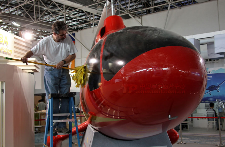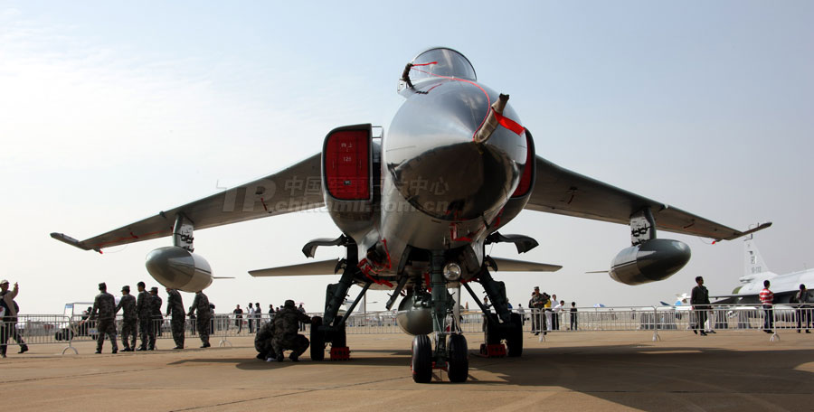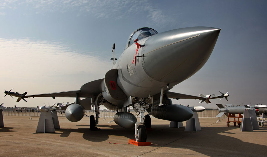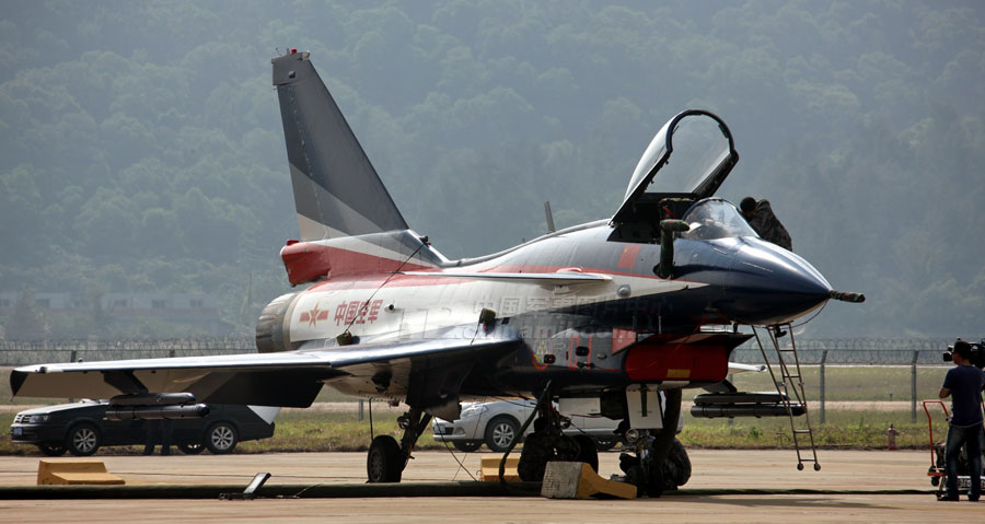 11月14日,參加第8屆中國(guó)國(guó)際航空航天博覽會(huì)的各場(chǎng)館基本布置就緒。圖為殲10表演機(jī)。圖片來(lái)源:中國(guó)軍網(wǎng) 喬天富 攝