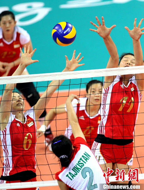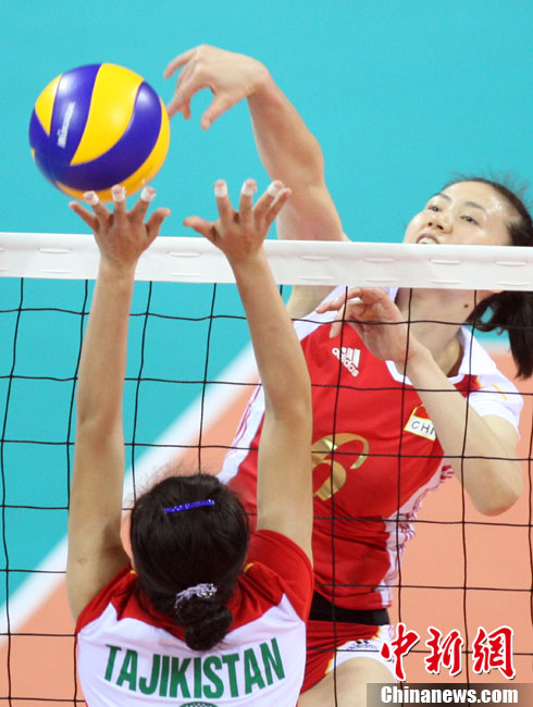 11月18日,廣州亞運(yùn)會(huì)女排比賽全面展開(kāi),中國(guó)隊(duì)首戰(zhàn)迎來(lái)塔吉克斯坦隊(duì)。最終,中國(guó)隊(duì)在老將周蘇紅的帶領(lǐng)下,以3比0輕松戰(zhàn)勝塔吉克斯坦隊(duì),迎來(lái)開(kāi)門紅。 中新社記者 湯彥俊 攝