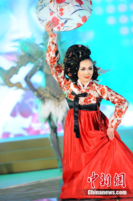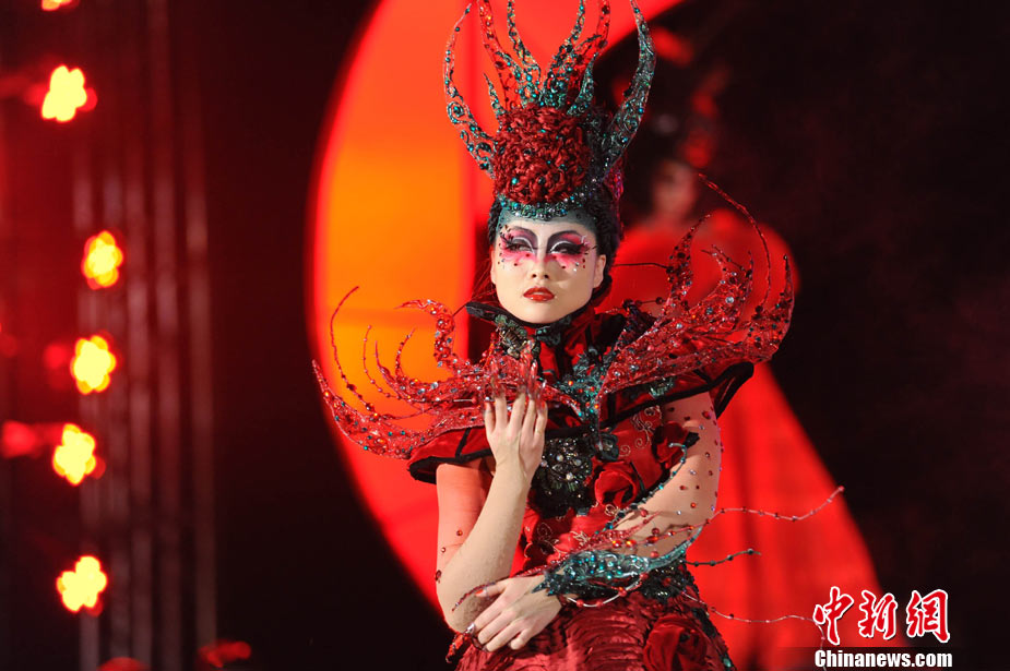 11月22日晚,第十屆中國國際美容美發(fā)化妝師全能大賽頒獎晚會在北京隆重舉辦。被業(yè)界譽(yù)為“中華美業(yè)第一賽”的全能大賽是中國一個超大規(guī)模的專業(yè)性賽事,當(dāng)天,容納6000多人的會場座無虛席。在400平米的專業(yè)舞臺上,來自日本、韓國、馬來西亞、新加坡及中國20多個省市自治區(qū)的40余支代表隊共400多名選手同臺競技,100多名專家評委現(xiàn)場評判。比賽過程精彩紛呈,亮點不斷,艷麗夸張的模特造型令觀眾大飽眼福。中新社記者 李學(xué)仕 攝