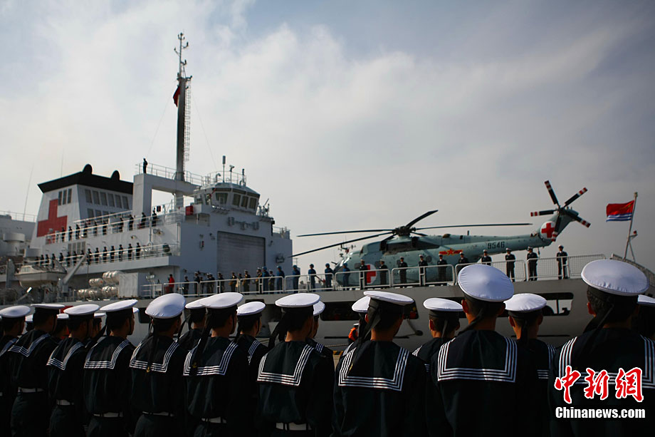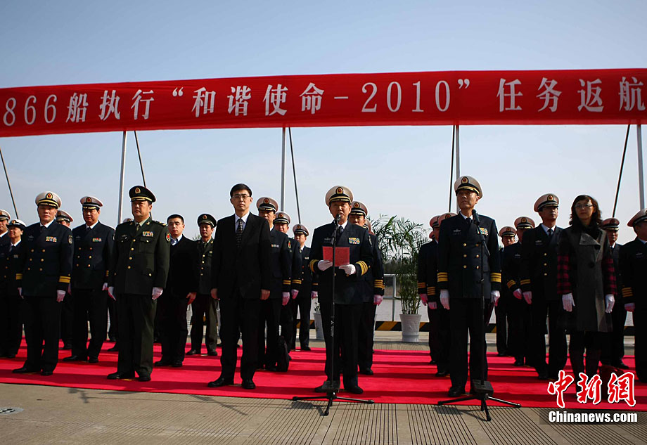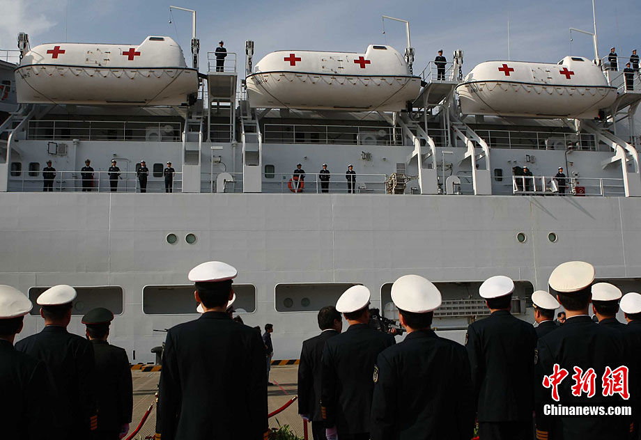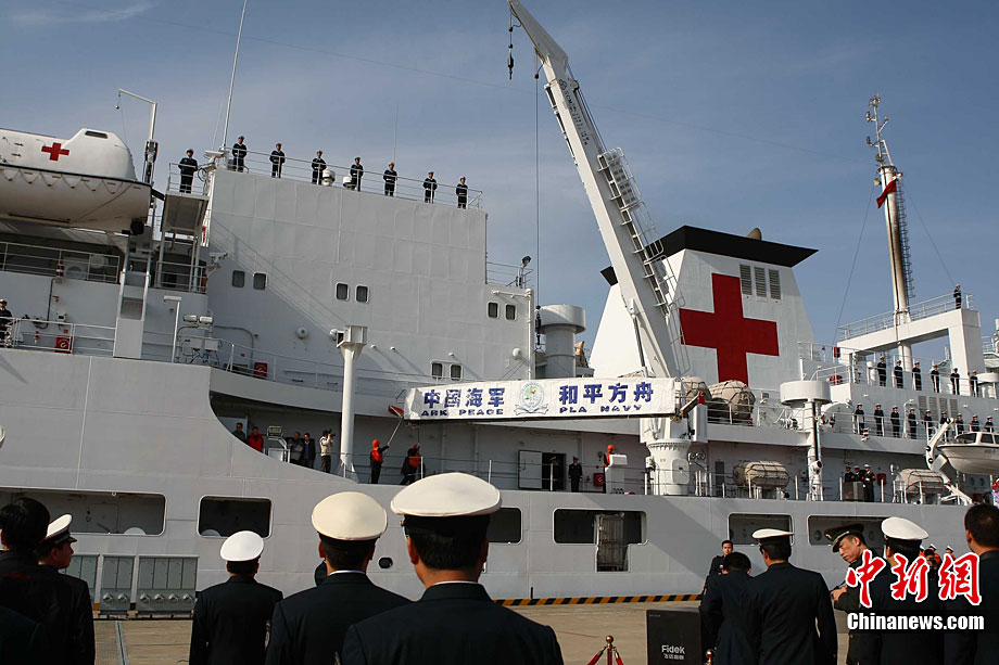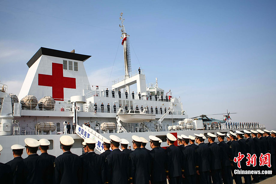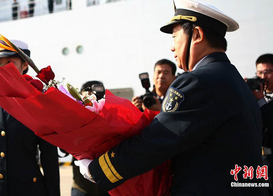 11月26日上午10時(shí),中國(guó)海軍萬噸級(jí)醫(yī)院船“和平方舟”安全駛抵舟山軍港,這支歷時(shí)88天、航程17800海里的海上醫(yī)療隊(duì)、為海軍護(hù)航官兵和吉布提、肯尼亞、坦桑尼亞、塞舌爾和孟加拉等國(guó)民眾體檢2127人,門診診治12806人、醫(yī)療巡診1858人,輔助檢查15537人次,成功實(shí)施手術(shù)97例,贈(zèng)送藥材36類790種。海軍副政委徐建中中將迎接執(zhí)行任務(wù)的官兵歸來。宋吉河 攝
