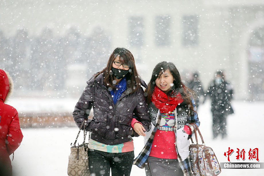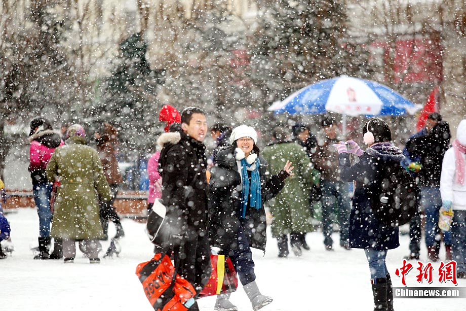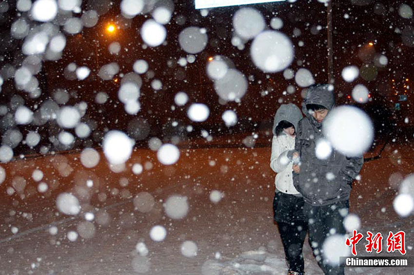 11月26日晚8時到27日早8時,吉林省大部分地區(qū)出現(xiàn)急降雪天氣,其中臨江降雪量最大,達到9.9毫米,截至目前,蛟河積雪最深,達到14厘米。這場大雪導(dǎo)致長春市龍嘉機場關(guān)閉近9個小時,到27日7時才開放,目前吉林省多條高速部分路段仍在臨時封閉中。圖為26日夜,一對情侶在大雪中行走。田偉 攝