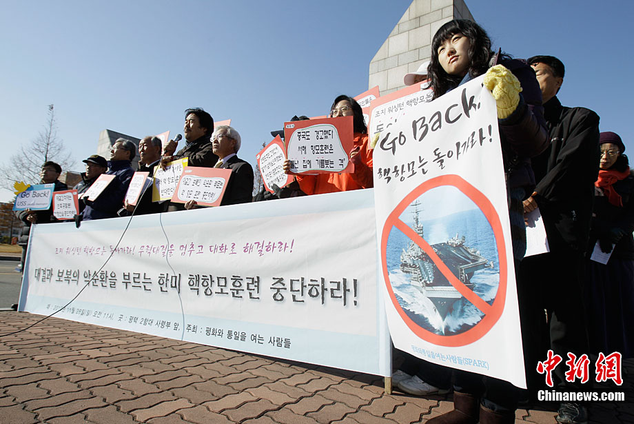 11月28日,韓國民眾在韓國軍事基地前舉行示威游行活動,譴責(zé)美國派遣航母參加美韓聯(lián)合軍演。這些民眾表示反對美國“喬治·華盛頓”號航母進(jìn)入韓國領(lǐng)土,并與韓國軍方舉行軍事演習(xí)。